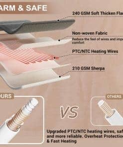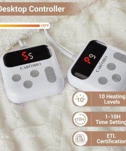 CAROMIO Manta Eléctrica Tamaño King con Control Dual – Manta Eléctrica Gruesa de Sherpa Acolchada Tamaño King con 10 Niveles de Calor y 10 Configuraciones de Tiempo, Certificada por ETL Manta Eléctrica de Calentamiento Rápido Tamaño King 90″�100″, Blanco. Eleva tu comodidad y estilo con nuestra manta eléctrica de sherpa tamaño king. Con un patrón de cable acolchado, agrega un toque de elegancia a tu hogar. Elaborada con sherpa jacquard de felpa larga de 240GSM en un lado y sherpa de 220GSM en el otro, ofrece una suavidad y comodidad excepcionales para una experiencia verdaderamente acogedora. Sumérgete en un calor rápido y constante con nuestro sistema de calentamiento mejorado. Nuestros cables de calentamiento actualizados y extendidos en un 10% proporcionan un área de calentamiento más grande, brindando un calor reconfortante en solo 20 minutos. Con 10 ajustes de calor, ajusta fácilmente la temperatura a tu preferencia. Disfruta de una temperatura máxima de 122 F, superando las mantas eléctricas regulares por 27 F. Tu seguridad es nuestra principal prioridad. Descansa tranquilo con nuestra manta eléctrica tamaño queen certificada por ETL que está equipada con cables de calentamiento inteligentes NTC&PTC. Estos cables monitorean y regulan continuamente la temperatura en tiempo real, garantizando una experiencia de calentamiento segura y confiable mientras te relajas y descansas. Experimenta ahorro de energía y conveniencia con nuestras características bien pensadas. La manta de calentamiento se apaga automáticamente después de 8 horas cuando la usas por primera vez y ofrece tiempos de apagado de 1 a 10 horas para mayor flexibilidad. Los controladores duales permiten a las parejas elegir sus temperaturas preferidas individuales, brindando comodidad personalizada. Monitorea y ajusta la temperatura fácilmente con el controlador LCD. Mantener tu manta eléctrica king limpia es sencillo. Simplemente retira el controlador de calentamiento y lava la manta en agua fría en un ciclo suave. Después de lavar, estira suavemente la manta de calor para que vuelva a su tamaño original para un rendimiento óptimo. Disfruta de la conveniencia de una manta de calentamiento limpia y fresca siempre que lo desees.