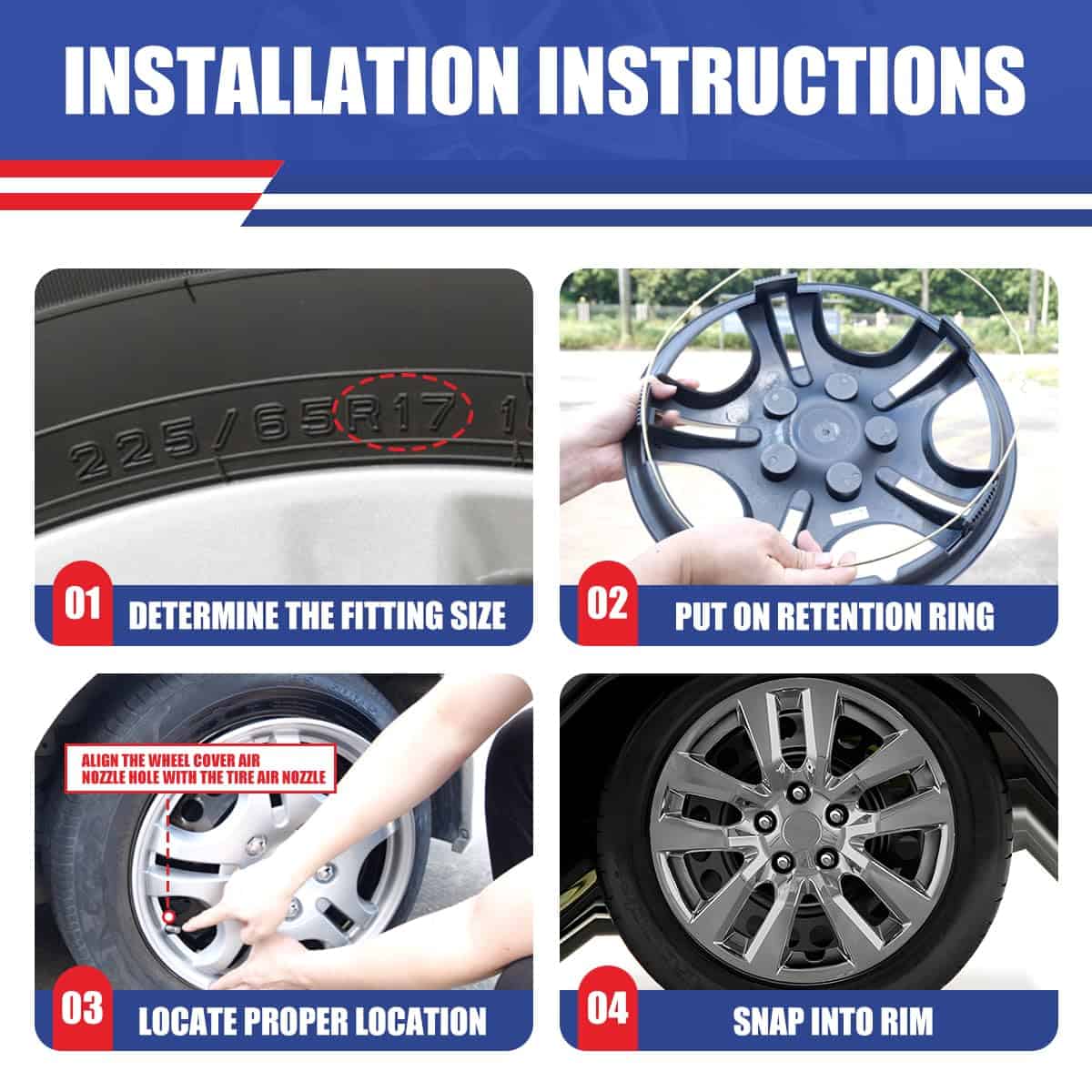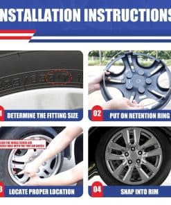 4. Instalación Sencilla: Instalar los tapacubos es pan comido, sin necesidad de herramientas especializadas. Simplemente verifique el tamaño del borde de la llanta (diámetro) ubicando el número que sigue a la marca «R». Asegúrese de que su tamaño de rin sea de 16″ para un ajuste perfecto.