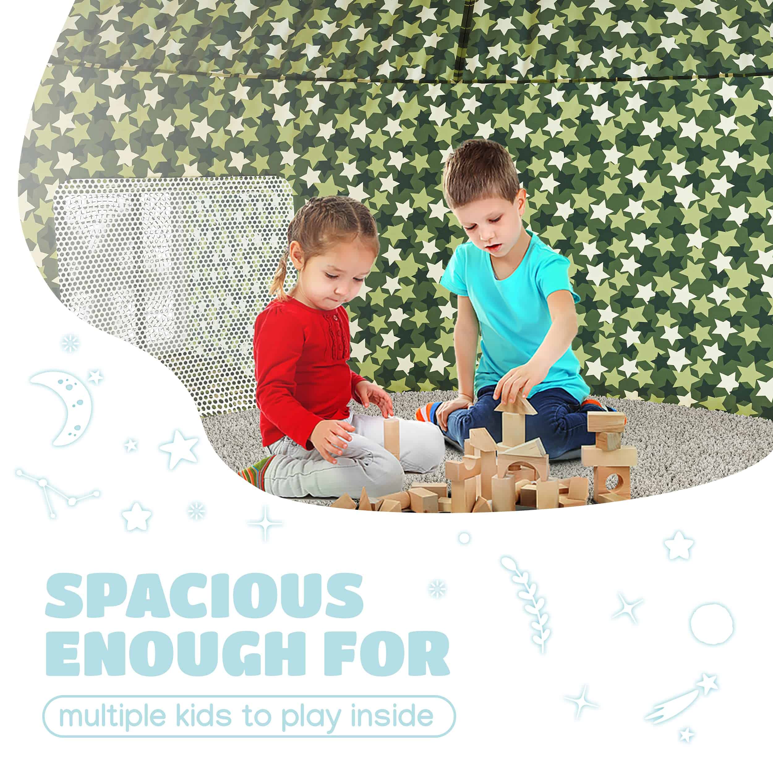 5. ESPACIOSA PARA VARIOS NIÑOS – Mide 77″ x 50″ y puede acomodar a varios niños e incluso adultos con mucho espacio para almohadas, mantas y juguetes.