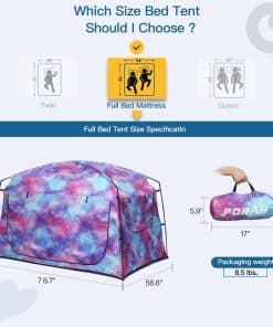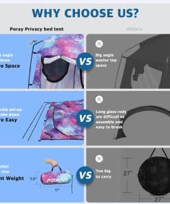 Nuestra tienda de cama de privacidad portátil es la solución perfecta para obtener privacidad y confort al dormir. Con un diseño que bloquea la luz en un 90%, proporciona un ambiente tranquilo y seguro para que tú y tus hijos disfruten de un sueño reparador. La tienda cuenta con 3 puertas con cremallera y una ventana lateral, así como malla transpirable para una ventilación adecuada. Además, su tamaño portátil permite un fácil almacenamiento y transporte. Puede utilizarse en camas o en el suelo, brindando un espacio de sueño privado y personal. La estructura de la tienda es resistente y estable, con un marco de varilla de fibra de vidrio de 9mm para mayor durabilidad. ¡Compra ahora y experimenta un descanso óptimo con nuestra tienda de cama de privacidad de alta calidad!