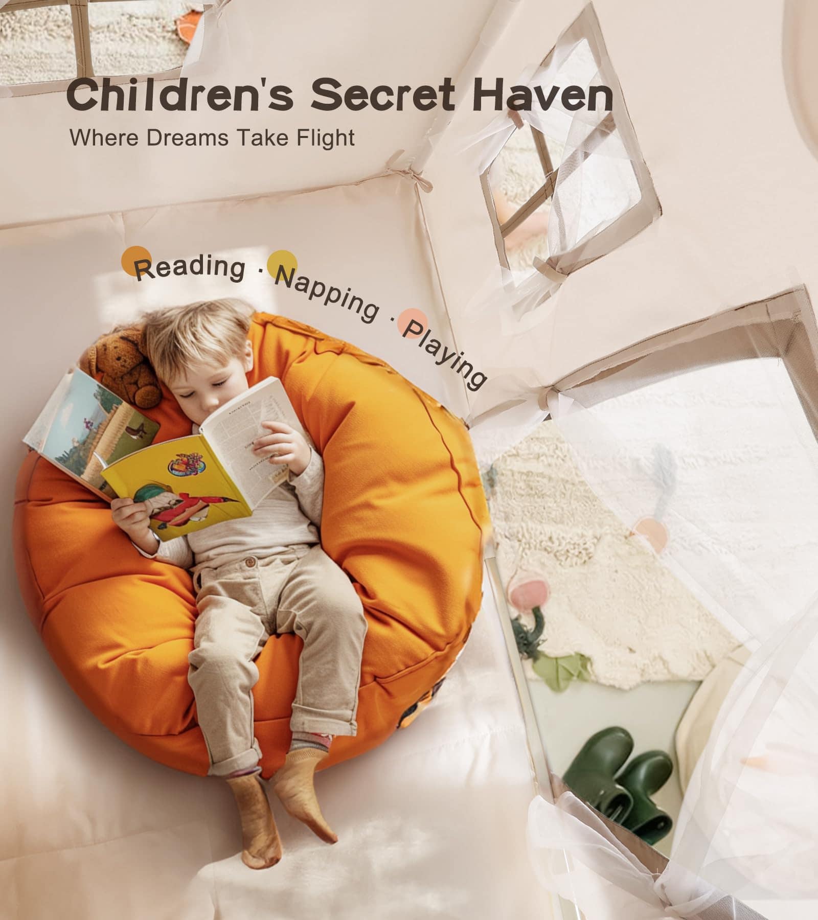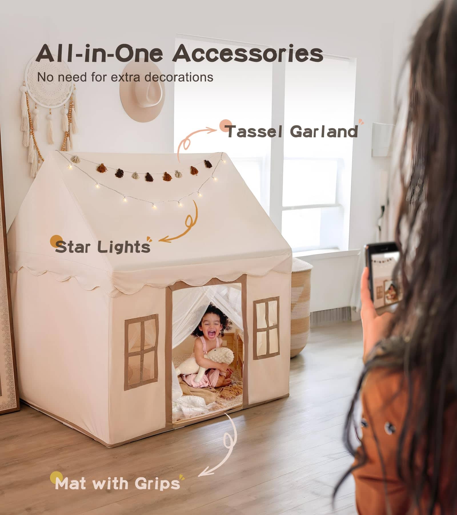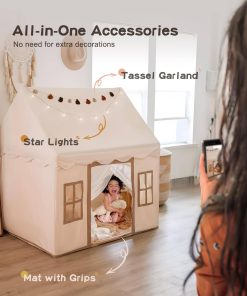 3. SET TODO INCLUIDO: Descubre un encantador refugio de juego con nuestro paquete completo. En su interior, descubrirás la adorable casa de juego, un conjunto de robustos postes de montaje, encantadoras luces de estrella, fascinantes guirnaldas de borlas y una alfombra antideslizante de tamaño generoso. Es un refugio mullido perfecto para juegos imaginativos, aventuras de lectura y siestas tranquilas.