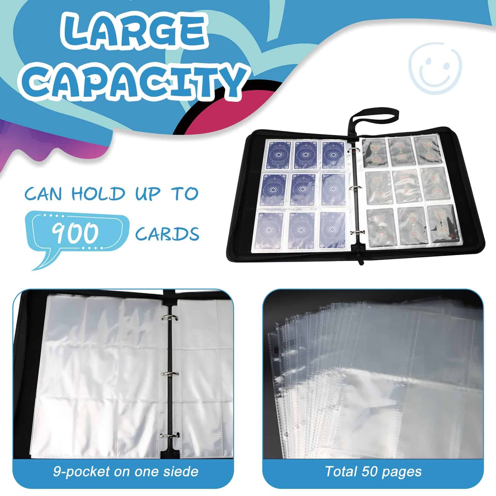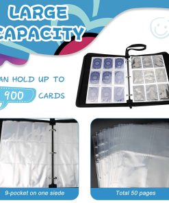 Soporte de tarjetas 3 anillos – Nuestro álbum de tarjetas deportivas presenta un diseño de anillo removible para durabilidad y portabilidad, lo que le permite agregar o quitar fundas para tarjetas, un diseño de 900 bolsillos y un álbum de 50 páginas con 18 tarjetas por página de doble cara. Se pueden recopilar un total de 900 tarjetas, puedes colocar perfectamente las tarjetas que deseas coleccionar, adecuadas para que los coleccionistas las lleven consigo y disfruten de la diversión. El diseño de la correa de muñeca lo hace más portátil y adecuado tanto para adultos como para niños. El diseño resistente con cremallera puede evitar eficazmente la pérdida de tarjetas al transportarlas, y el bolsillo de PVC de doble costura es altamente transparente, por lo que puedes ver claramente cada tarjeta. Sus tarjetas están bien protegidas y claramente visibles, y la característica a prueba de agua garantiza que las tarjetas estén seguras e intactas incluso en caso de accidente. Amplia gama de aplicaciones: los soportes de tarjetas favoritos son adecuados para la mayoría de las tarjetas de tamaño estándar. Nuestros soportes portátiles con cremallera son el accesorio ideal no solo para tarjetas de intercambio, tarjetas de béisbol, tarjetas Yu-Gi-Oh!, tarjetas MTG, tarjetas de béisbol, tarjetas de colección de estrellas de fútbol, naipes, juegos de cartas y otros entusiastas que desean mostrar sus colecciones con estilo. Regalos especiales: este soporte para tarjetas tiene un diseño nuevo, perfecto para regalos de Navidad, Año Nuevo o cumpleaños, los álbumes de tarjetas de intercambio son el regalo perfecto para niños y niñas. La cubierta vívida y colorida atraerá fácilmente su atención y los hará enamorarse de este protector de tarjetas. Si recibe el producto tiene algún problema de calidad, no dude en decírnoslo, sus sugerencias tienen un gran impacto en la mejora de nuestro producto!