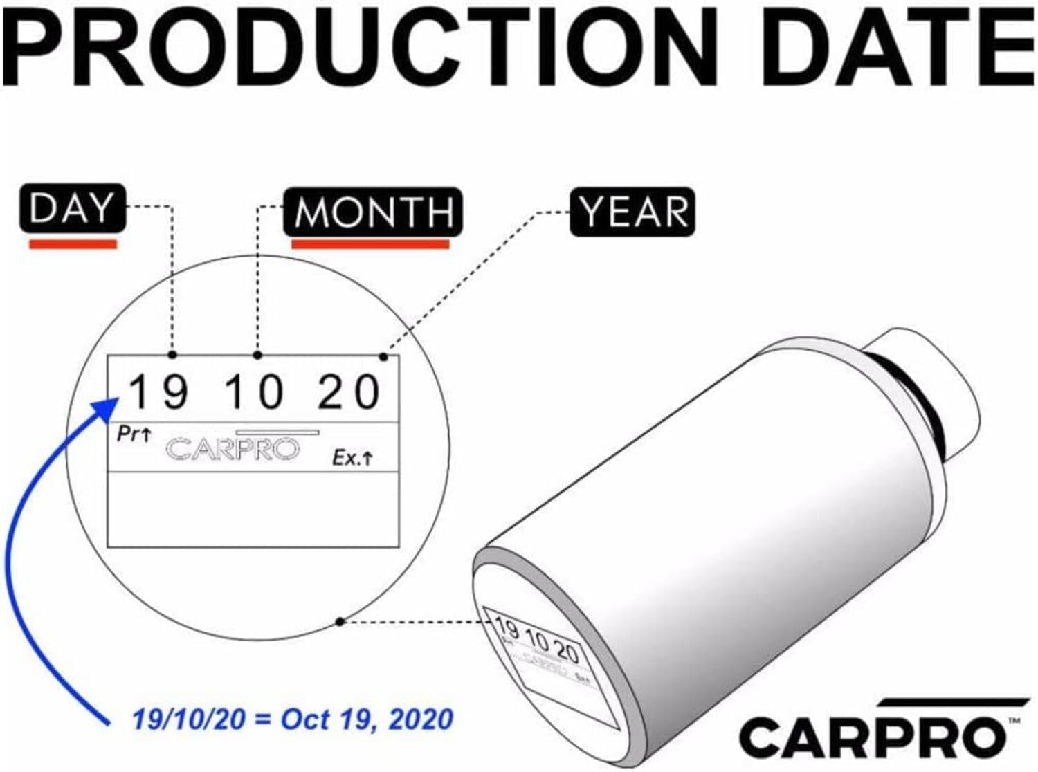 5. Empaqueta el brillo similar al cristal, la hidrofobicidad y la repelencia a la suciedad de la nanotecnología de sílice en un sellador en aerosol, de fácil aplicación y retirado. 6. Fórmula a base de agua compuesta principalmente de Sio2 (Cuarzo) modificado especial. Excelente para retocar CQUARTZ. 7. Reload mantiene su pintura limpia por más tiempo, facilita el lavado del auto y le permite secarlo más rápidamente. 8. La pintura debe estar completamente limpia y libre de aceite, solventes o cera antes de aplicar Reload. No aplicar bajo luz solar directa. 9. Los productos CARPRO vienen con solo una FECHA DE PRODUCCIÓN («Pr» o «PD») escrita en formato día/mes/año. CARPRO Reload 2.0 es bueno por al menos dos años a partir de la Fecha de Producción