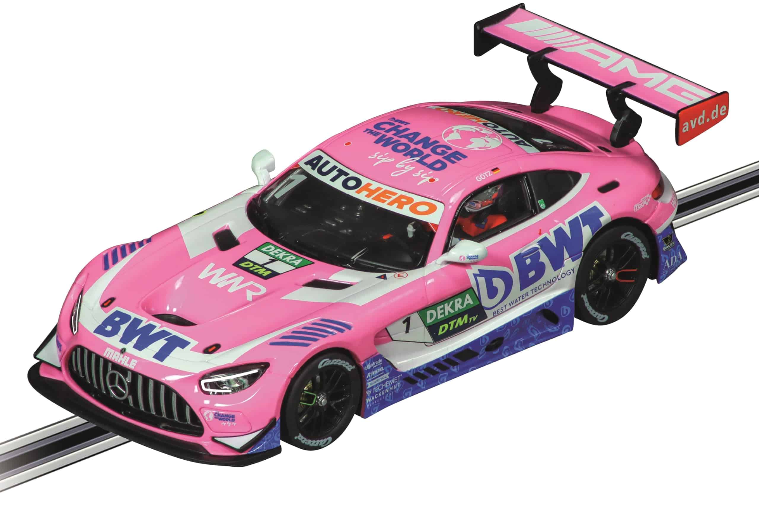 El Mercedes AMG GT3 Evo es un clásico moderno del automovilismo de turismo. El auto de Carrera DIGITAL 132 Mercedes-AMG GT3 Evo ‘Mercedes-AMG Team Winward M. Götz’ es el último auto conducido por el campeón de DTM 2021 Maximillian Götz. El campeón comenzó la nueva temporada de DTM 2022 con un nuevo auto, un nuevo equipo y con una pintura rosa, blanca y azul, pero no logró alcanzar las alturas de la temporada anterior. El auto de slot digital a escala 1:32 está impulsado por un motor E200. Cada auto está equipado con escobillas dobles reemplazables para máximo contacto con la pista de slot, mientras que los imanes de adherencia en la parte inferior permiten maniobras rápidas y excelente manejo. Los autos digitales de Carrera son realmente llamativos con estampados de alta calidad sobre moldes detallados diseñados para replicar fielmente el auto original. Las luces delanteras y traseras operativas agregan a la apariencia impresionante e incluso el interior y el piloto en el interior lucen tan bien como el exterior! Este auto de Carrera Digital 132 a escala 1:32 funcionará en todas las pistas de slot digital de Carrera. El interruptor ubicado en el fondo del auto también le permite cambiar a modo analógico para competir en una pista Evolution.