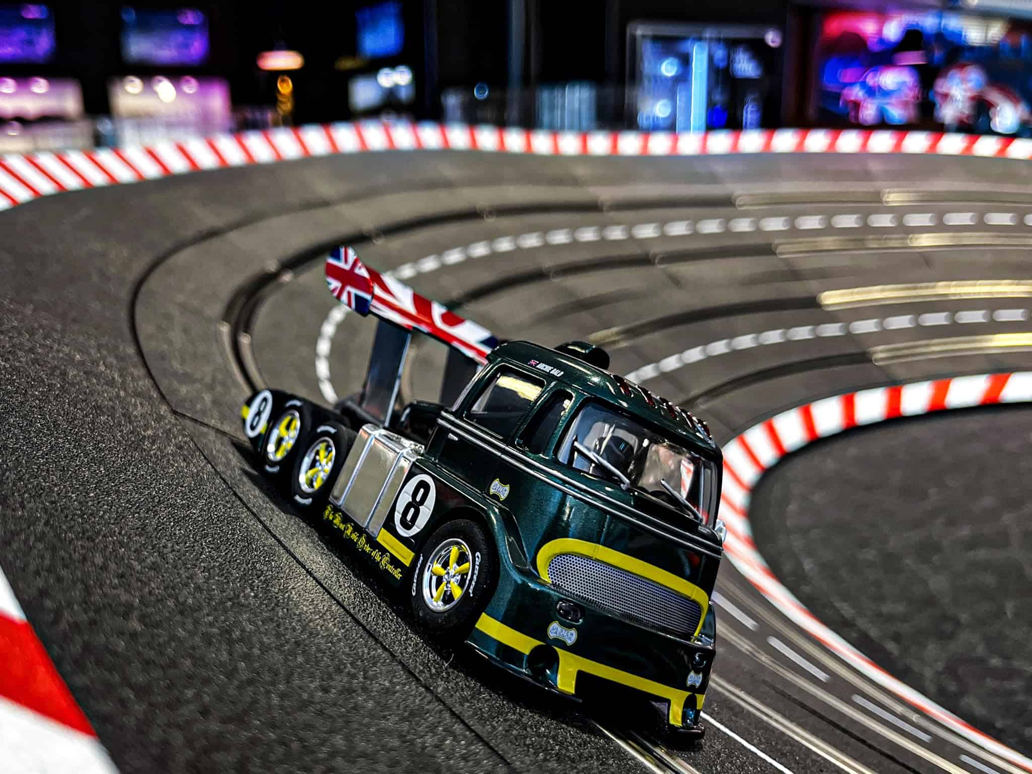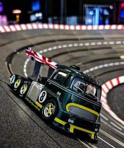 La pista de carreras es el lugar perfecto para que el Carrera Racetruck Cabover ‘British Racing Green, No.8’ muestre lo que un camión puede hacer. La camioneta verde con su cabina aerodinámica y gran alerón trasero es un auténtico atractivo en la pista, desempeñándose de manera convincente con su increíble potencia en cada batalla de carreras. El coche de slot digital a escala 1:32 está impulsado por un motor E200. Cada coche está equipado con cepillos de contacto doble reemplazables para un máximo contacto con la pista, mientras que los imanes de adherencia permiten una rápida entrada en curvas y un excelente manejo. Los coches digitales de Carrera son verdaderos atrae-miradas, con una impresión tampo de alta calidad sobre moldes detallados diseñados para replicar fielmente el coche original. Los faros delanteros y las luces de freno traseras en funcionamiento añaden al aspecto impresionante y hasta el interior y el conductor en su interior lucen tan bien como el exterior. Este Coche Carrera Digital 132 a escala 1:32 funcionará en todas las pistas de slot digital de Carrera. El interruptor ubicado en la parte inferior del coche también le permite cambiar al modo analógico para carreras en una pista Evolution.