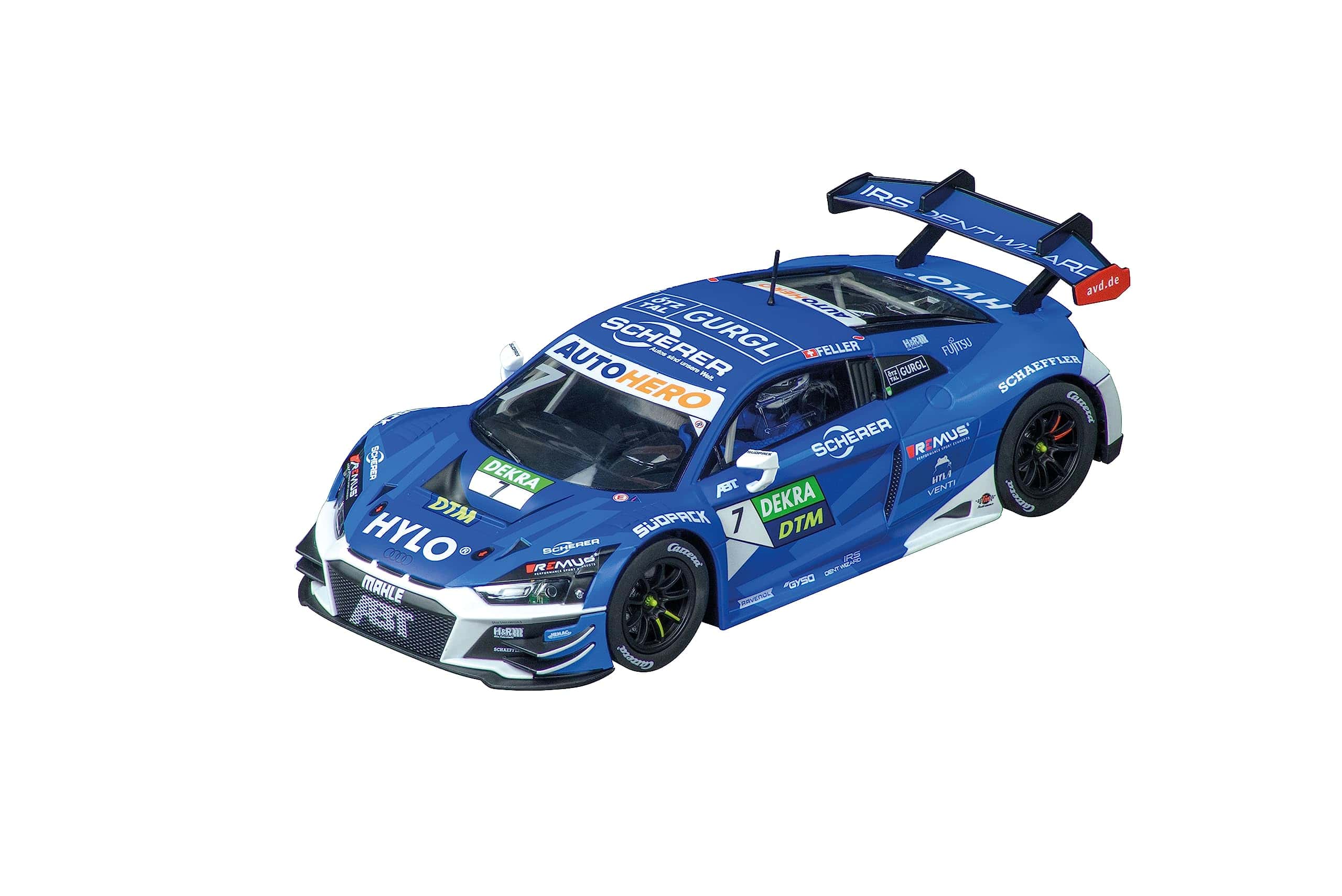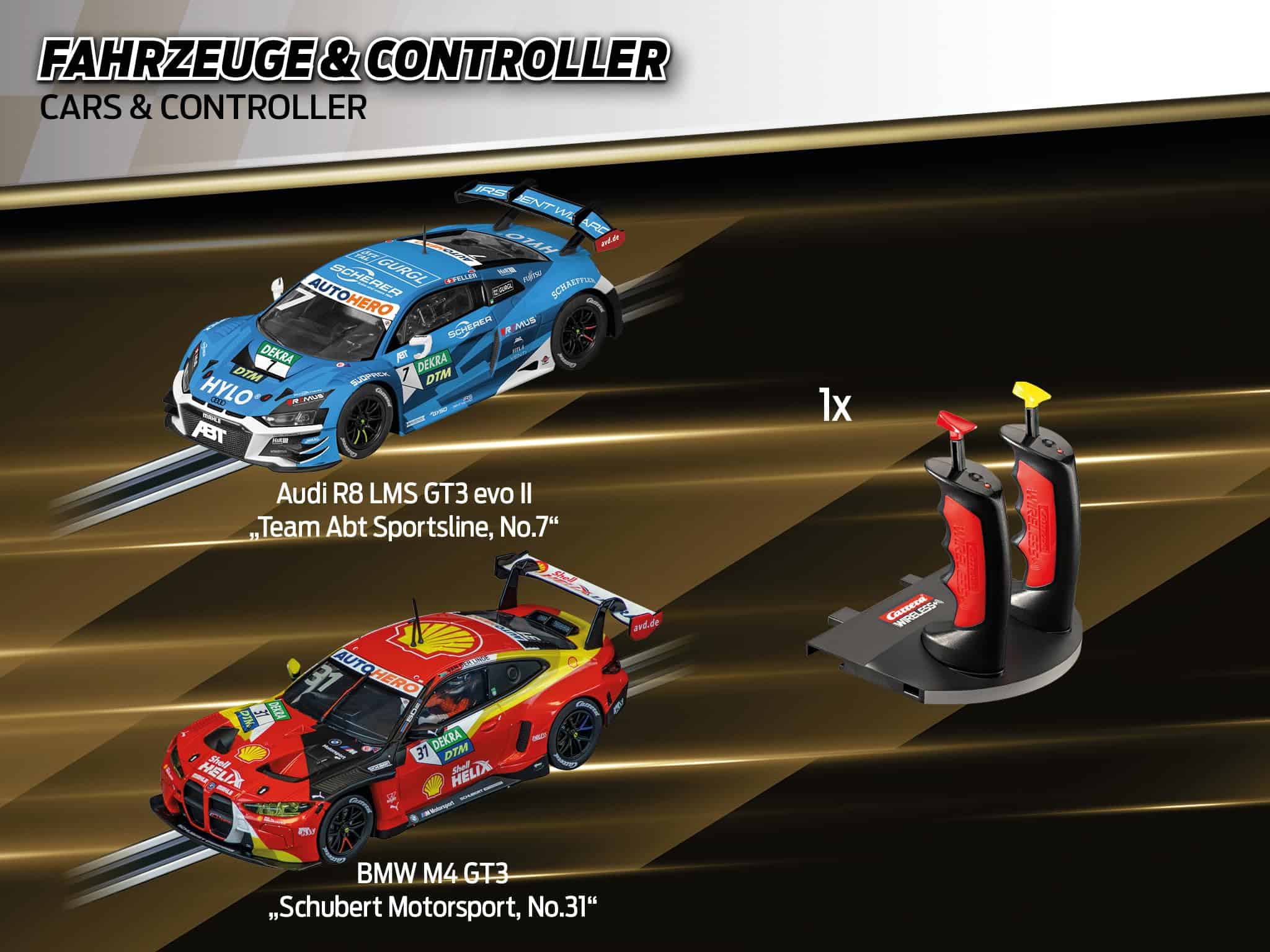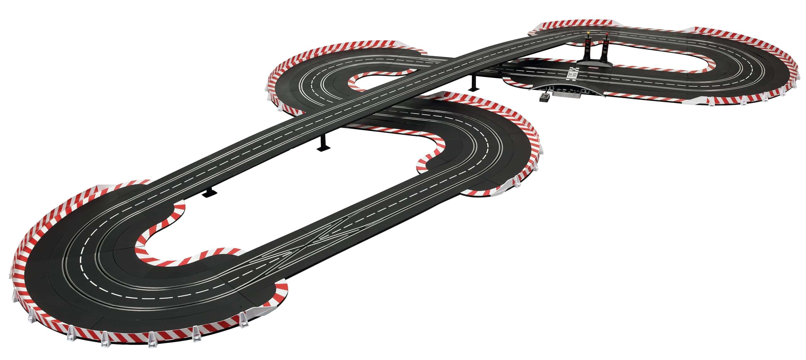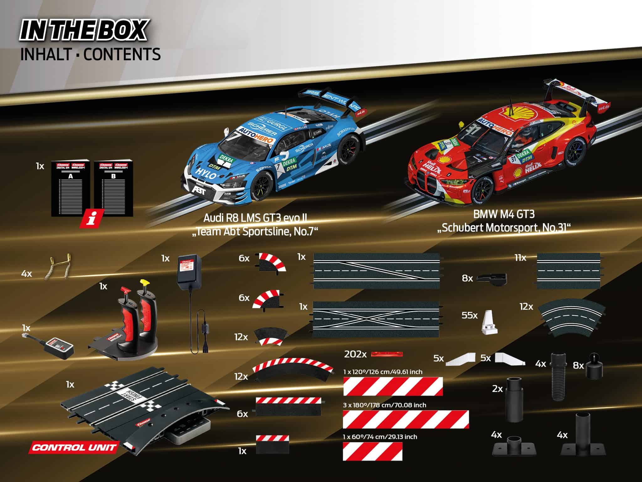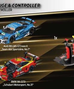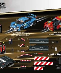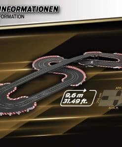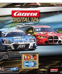 ¡Pon en marcha tus motores y prepárate para experimentar la emoción de las carreras de autos a escala con el sistema de pista de carreras de autos slot de gama alta Carrera Digital 124 Full Speed! Este set viene con 2 controladores de velocidad inalámbricos de 2.4 GHz para mayor libertad y movimiento alrededor del área de la pista. Las carreras de autos slot te traen la apariencia, sensación y emoción de la conducción real de autos de carreras, ¡pero con control total detrás del volante! Los autos Digital 124 han sido cuidadosamente diseñados para verse exactamente como los autos reales hasta en el más mínimo detalle. ¡Pronto tu corazón latirá rápido mientras aceleras por las rectas o derrapas en una curva cerrada para meterte en 1er lugar y reclamar la bandera a cuadros antes que tu competencia! Toda esta acción se puede disfrutar en la comodidad de tu hogar. El conjunto Digital 124 Full Speed cuenta con autos a escala 1:24 corriendo en una pista digital a escala 1:24. La pista de autos slot establece el escenario para un duelo a alta velocidad de un Audi R8 LMS GT3 Evo II «Equipo Abt Sportsline No.7», DTM 22 y un BMW M4 GT3 «Schubert Motorsport No.31», DTM 22. Con estos dos autos de carreras populares, ¡tú, el conductor, tienes la clave de quién obtiene la bandera a cuadros en esta emocionante carrera cara a cara! ¡Corre en un curso que se extiende por más de 31 pies y cuenta con curvas, una sección de cambio de carril y rectas para ofrecer acción emocionante en toda la pista. Solo el conductor con las mejores habilidades puede dominar la pista y reclamar la victoria al final! Se garantizan horas de acción y diversión. Las carreras de autos slot son una emocionante actividad grupal entre amigos y familiares y tú también disfrutarás corriendo una y otra vez. La Serie Carrera Digital 124 te permite correr hasta 4 conductores a la vez para que nadie quede excluido! Las piezas de pista intercambiables te permiten configurar el diseño del curso según tu preferencia. Con una variedad de accesorios disponibles, sets de expansión de pistas y una amplia selección de autos adicionales, ¡este sistema completo de pista de autos slot se puede ampliar y modificar para posibilidades infinitas y más carreras increíbles.