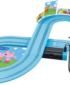 ¡Niños de tan solo 3 años ahora pueden agarrar los controles y correr a toda velocidad alrededor de esta pista de carreras apta para niños! ¡Corre con tus personajes favoritos Peppa Pig y George de la popular serie de televisión infantil, Peppa Pig. Cada set de carreras de coches slot de Carrera First presenta un divertido ambiente temático en una pista construida alrededor de sus personajes de coche, programa de televisión, película o videojuego favoritos. Tu hijo encontrará que mantenerse en la pista es fácil con los controladores de velocidad regulados electrónicamente que les permiten correr sin parar en una emocionante acción de cabeza a cabeza contra sus amigos o hermanos. Los primeros sets, que están construidos a una escala de 1:50, son una gran introducción al emocionante y rápido mundo de las carreras de coches slot. La pista de 7.87 pies funciona con 4 pilas tipo C (no incluidas) y es fácil de montar o desmontar para moverla de una habitación a otra o llevarla contigo. ¡Los niños disfrutarán de horas de diversión interminable corriendo sus coches alrededor de la pista y compitiendo por el primer lugar! ¡Bienvenido a la familia Carrera de carreras de coches slot!