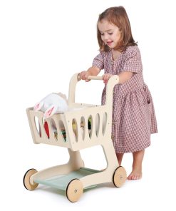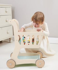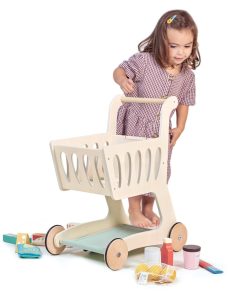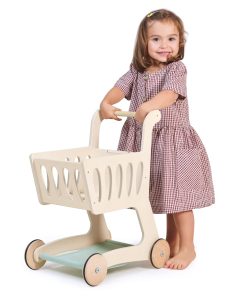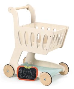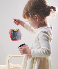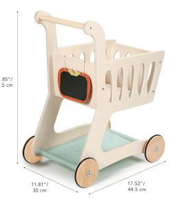 Reúne los comestibles y dirígete a la caja con este carrito de compras bellamente elaborado y de tamaño infantil. Los niños pueden divertirse con el juego de simulación de compras con amigos, practicar sus habilidades de conteo, fomentar la independencia y la responsabilidad y practicar habilidades lingüísticas. Zumbando por los pasillos en casa con nuestro elegante carrito de compras de madera, a tu pequeño comprador le encantará imitar a mamá y papá. Una base de tela agrega espacio adicional para todas esas delicias de supermercado y un pequeño pizarrón en forma de manzana es perfecto para hacer una lista de compras o dibujar imágenes. ¡Prueba esto junto con nuestro Set de Supermercado para una diversión de juego definitiva! La construcción de madera sólida de caucho y contrachapado sostenible hacen de este un juguete que tu hijo podrá amar durante años.