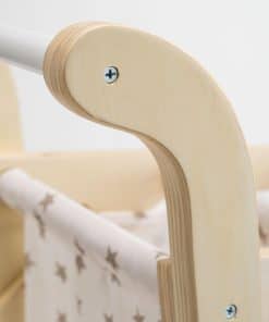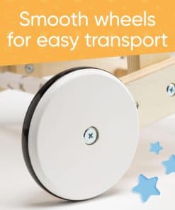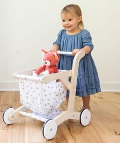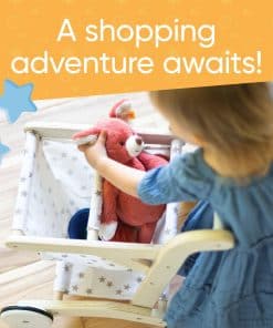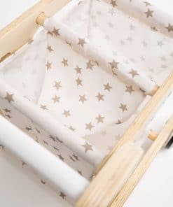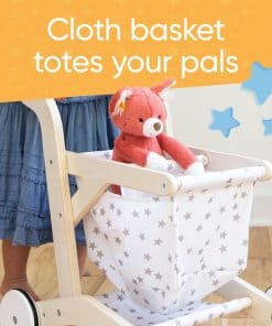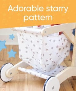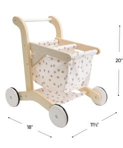 Carrito de compras de madera para juego de imitación con canasta de tela extraíble impresa con estrellas doradas. Ideal para que los niños practiquen empujar y rodar. Hecho de materiales naturales y lavables. Cuenta con estante inferior para llevar juguetes y tesoros adicionales.