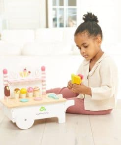 2. DESARROLLA DESTREZA Y RESOLUCIÓN DE PROBLEMAS – ¿Cuántas veces ha seguido hablando tu hijo apenas entras en la heladería Este carrito de helados de madera fomentará ese mismo entusiasmo para comunicarse con sus amigos mientras perfecciona su destreza y habilidades de resolución de problemas al colocar helado en conos, cerrar el congelador y DEVOLVER TODO cuando es hora de la limpieza.
