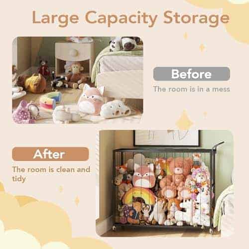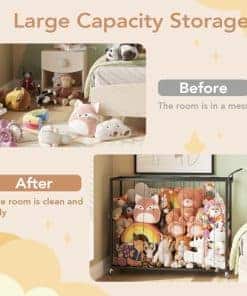 Este soporte de almacenamiento de peluches con diseño en forma de zoológico hará que la limpieza sea un juego divertido y educativo para los niños. Con una capacidad de hasta 60 juguetes pequeños, 40 medianos o 20 grandes, este carrito de almacenamiento es una solución perfecta para mantener los juguetes de peluche organizados y al alcance de los niños. Fabricado con acero resistente, este organizador de almacenamiento es duradero y puede soportar el peso de los peluches sin deformarse. Con ruedas de rodaje suave, este carrito de juguete permite una movilidad sencilla, lo que facilita la reubicación de los juguetes de una habitación a otra. El diseño abierto del organizador garantiza una ventilación adecuada, manteniendo los peluches frescos y libres de polvo. Además de ser ideal para almacenar peluches, este carrito también es adecuado para guardar almohadas, mantas u otros artículos, lo que lo convierte en una solución de almacenamiento versátil para habitaciones de niños o espacios familiares. Fácil de montar y con un acabado elegante en blanco, este carrito de almacenamiento de peluches es un regalo práctico y pensado para cumpleaños, baby showers o festividades, ayudando a las familias a recuperar su espacio con estilo.