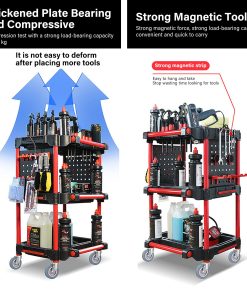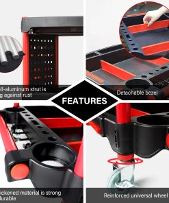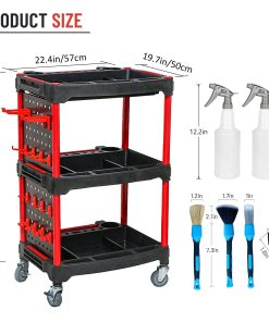 Este carrito de detallado de coche se puede utilizar para organizar, almacenar y mover herramientas de lavado y película de tamaño pequeño a mediano y consumibles. Cada tablero de nivel está diseñado con separación de tablero divisorio. El panel de partición se puede desarmar e instalar según sea necesario, y el área de trabajo está dividida, de modo que el trabajo sea más organizado. Características – Color: Negro y rojo. – Material: PP, aluminio. – Tamaño: 57 x 50 x 92 cm/ 22.4 x 18.7 x 36.2 pulgadas. – Instalación conveniente, estructura de tres capas, almacenamiento y uso de superposición, amplia gama de usos. – La bandeja está diseñada con particiones separables y es ampliamente aplicable. – Cuatro ruedas universales de asistencia se encuentran en la parte inferior, lo que es ligero para mover y ahorra tiempo y esfuerzo. – Tiene un alto valor práctico y se puede combinar con varias tablas colgantes de gancho para facilitar la clasificación y el uso de diversas herramientas. – El cuerpo principal está hecho de material PP y el pilar está hecho de tubo de aluminio de alta resistencia. Es duradero en uso. Paquete Incluido 1 x Carrito de Detalle de Lavado de Coche