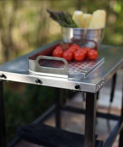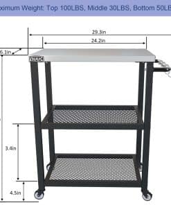3. Portabilidad Móvil La repisa de acero de malla, la estructura de patas de tubo y el material de acero inoxidable reducen su peso y lo hacen muy ligero. Cuatro ruedas giratorias de 360 grados y asas laterales le permiten mover fácilmente esta mesa de comida.