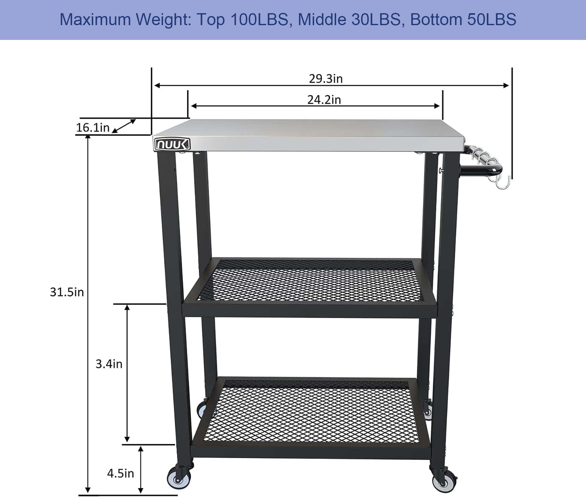 1. Diseño Práctico Multifuncional La plataforma de la mesa de comedor de acero inoxidable está compuesta por partes superior, media e inferior, con espacio suficiente para almacenar todo tipo de utensilios de mesa, alimentos y condimentos. Cuenta con cuatro ganchos en forma de ‘S’ y un asa lateral firme para colgar toallas, vajilla y alimentos.