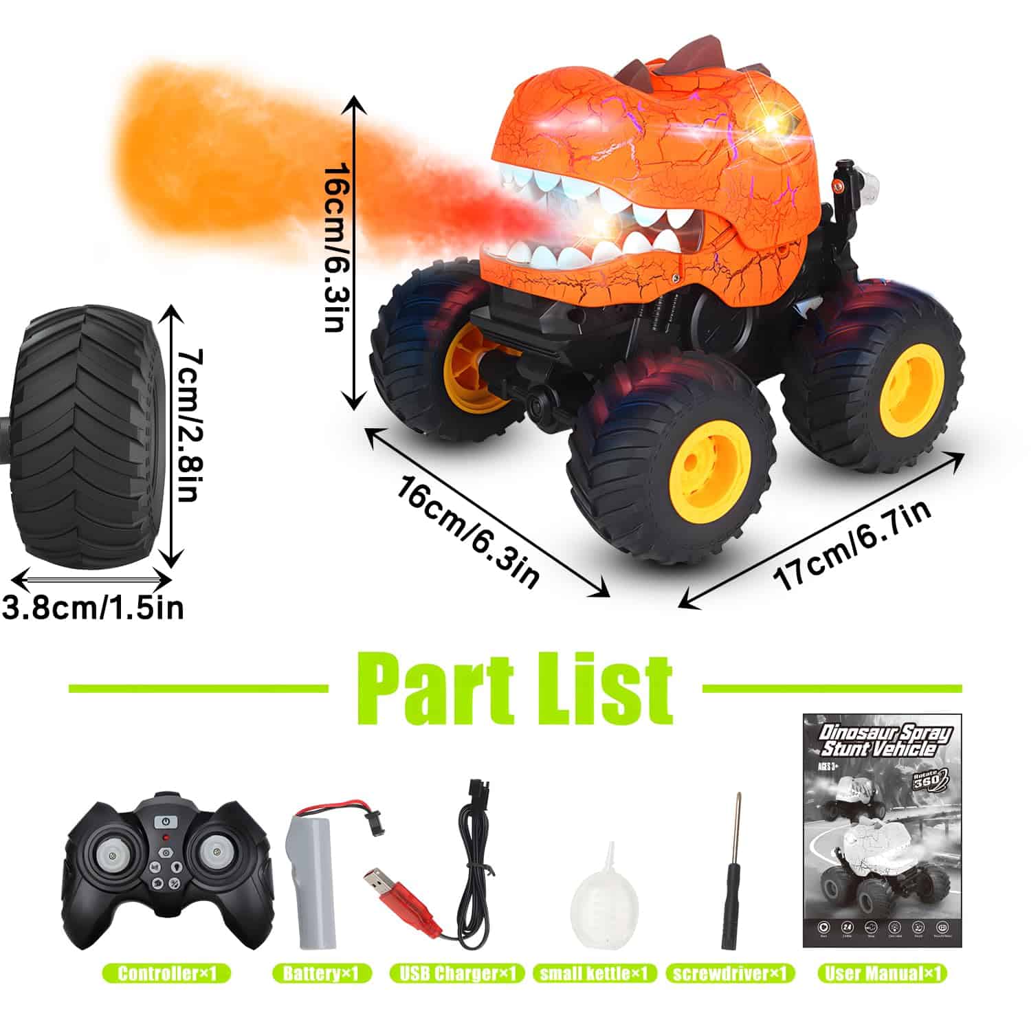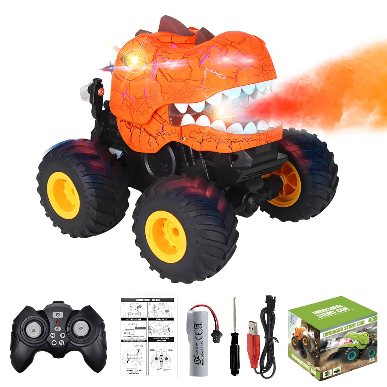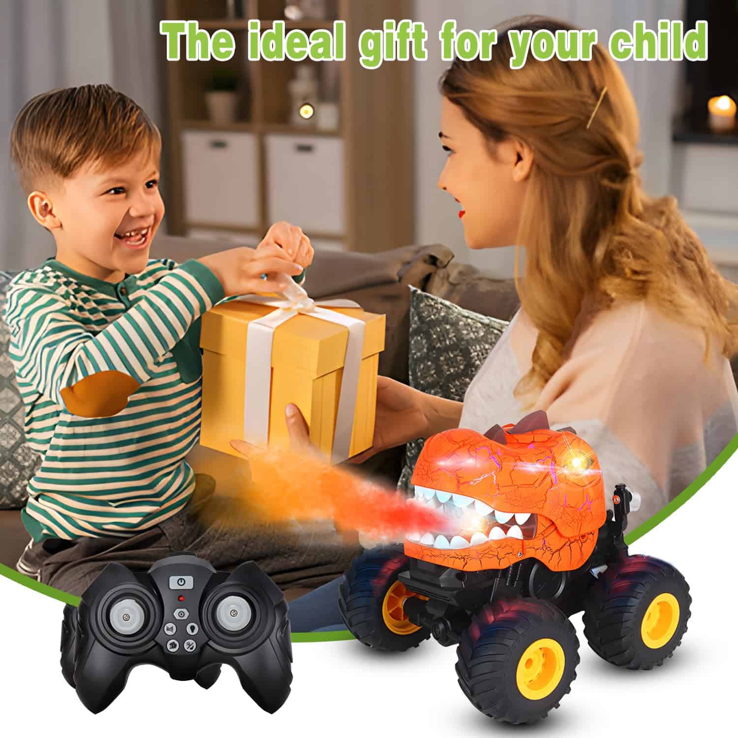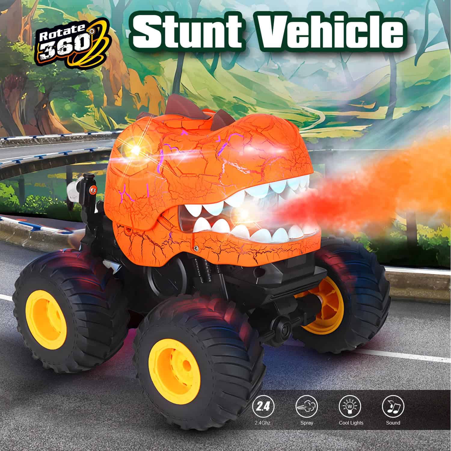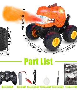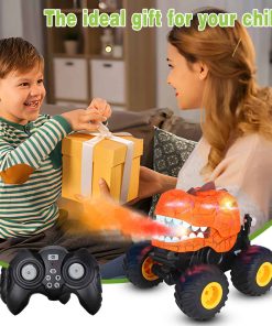 2. Música, Luces y Rocío: Con una función de rociado de rocío distinta, el cuerpo del dinosaurio cuenta con un diseño de grietas único que puede hacerlo cobrar vida con 3 modos de iluminación diferentes, desde destellos rápidos y furiosos hasta pulsaciones lentas y constantes e incluso iluminación continua. El carro de control remoto para niños de 4 a 7 años también puede reproducir música a través de los altavoces incorporados y puedes cambiar la música y apagarla fácilmente con el control remoto.