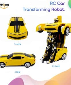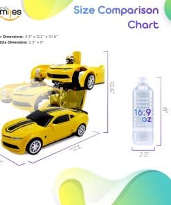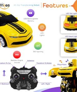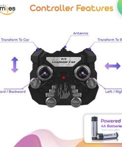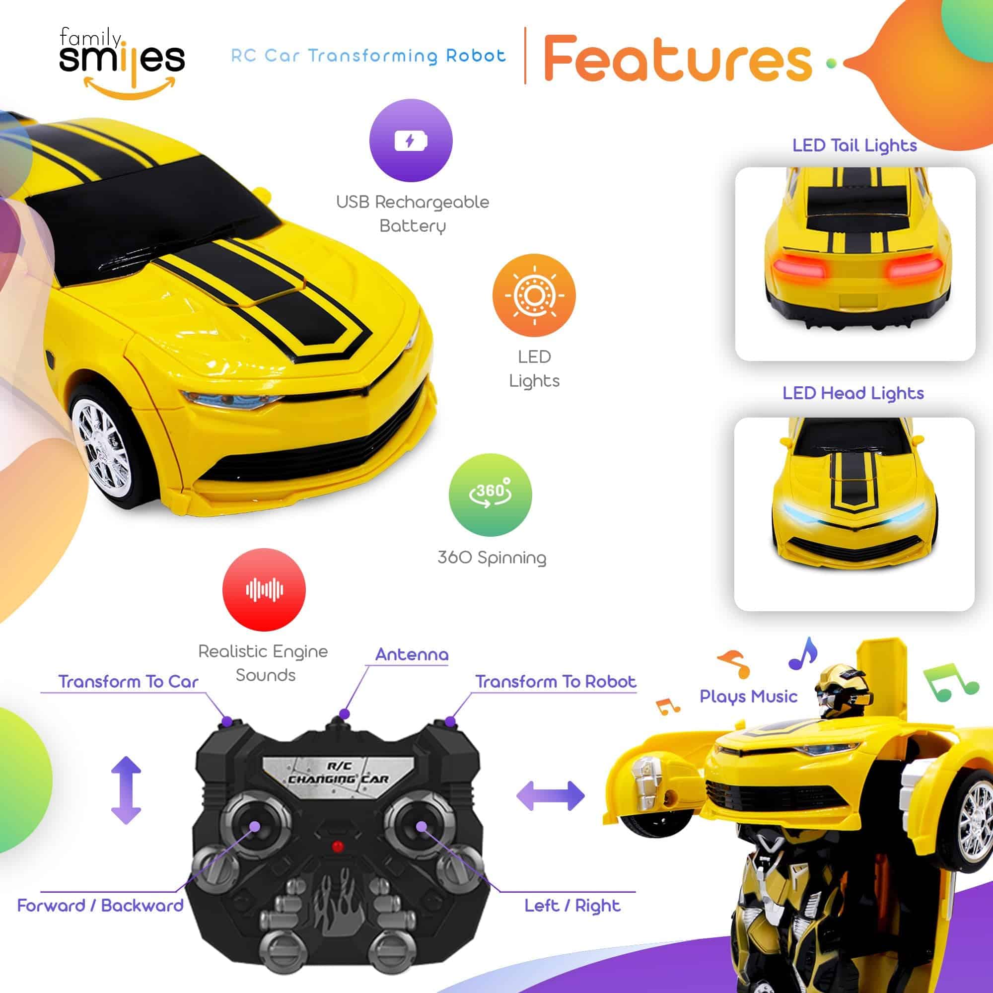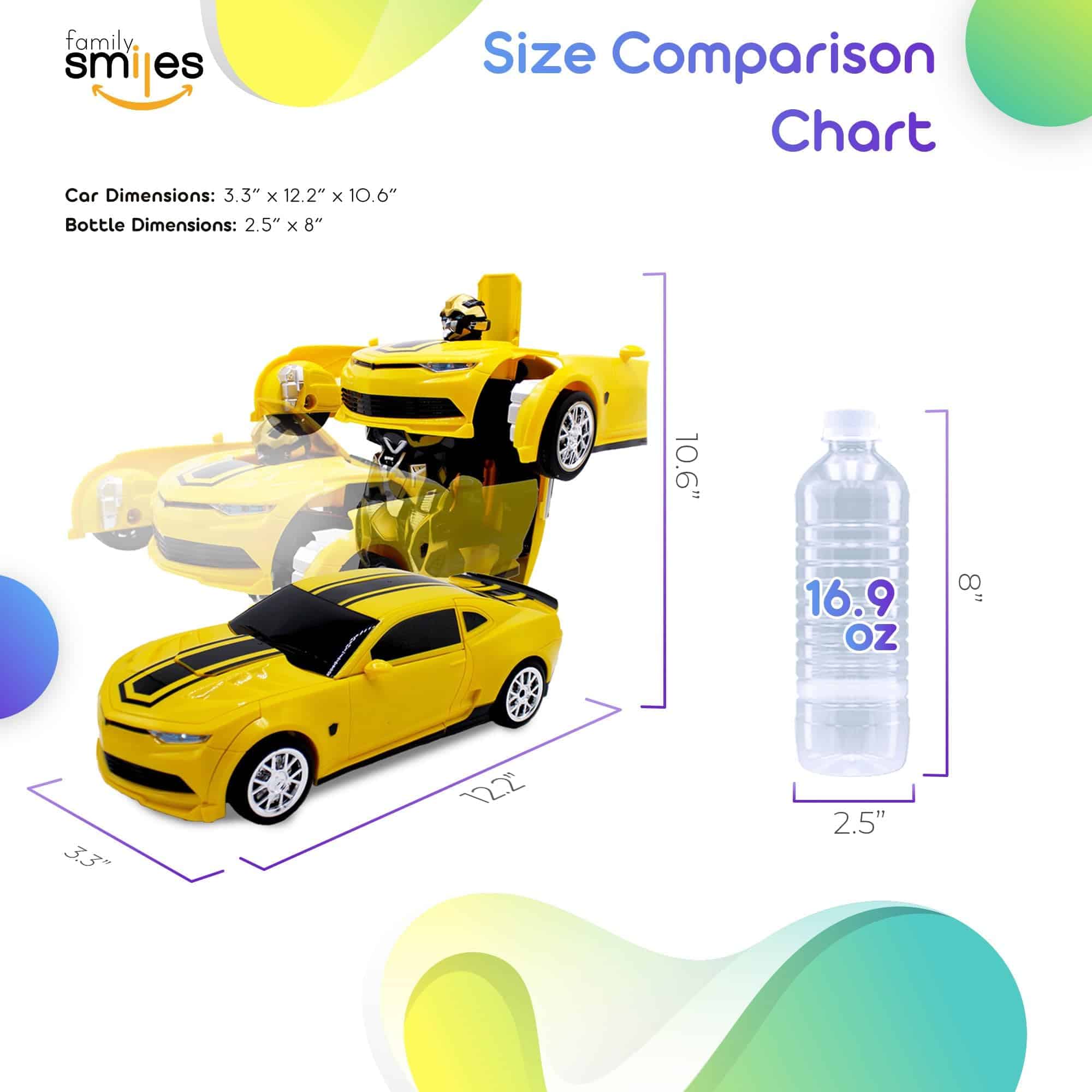 Fácil de operar: tiene un botón para transformar de carro RC a robot RC. El juguete se transforma de ida y vuelta fácilmente y es muy emocionante. El vehículo transformable tiene un sonido de motor realista y acelerado: adelante, atrás, izquierda y derecha, derrapes de 360 rpm. Está hecho de material de alta calidad: neumáticos de goma de alta calidad, firme agarre, resistencia al desgaste y resistencia a la compresión; Volante flexible, estructura delicada y firme; Transmisor fuerte de 2.4 GHz: control a una distancia de 15-20 metros. Puede transformarse automáticamente de carro a robot al presionar el botón en el control remoto. Se transforma fácilmente de ida y vuelta y es realmente increíble. Combina carro y robot. Excelentes opciones de 2 controles remotos, que te permiten jugar con tu hijo simultáneamente. Tiene 4 ruedas suaves y puede girar 360 grados de manera flexible tanto en modo robot como en forma de carro. Tiene luces LED frontales y el robot emite sonidos impresionantes cuando aceleras, juegas hacia adelante, atrás, giras a la izquierda y a la derecha. Material: Plástico ABS Tiempo de Carga: 1H Carro Requiere: batería de li-po 3.7V 350mAh Tamaño del Robot: 7.9 x 4.5 x 10.6 pulgadas Tamaño del Carro: 12.2 x 4.7 x 3.3 pulgadas