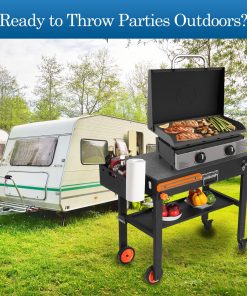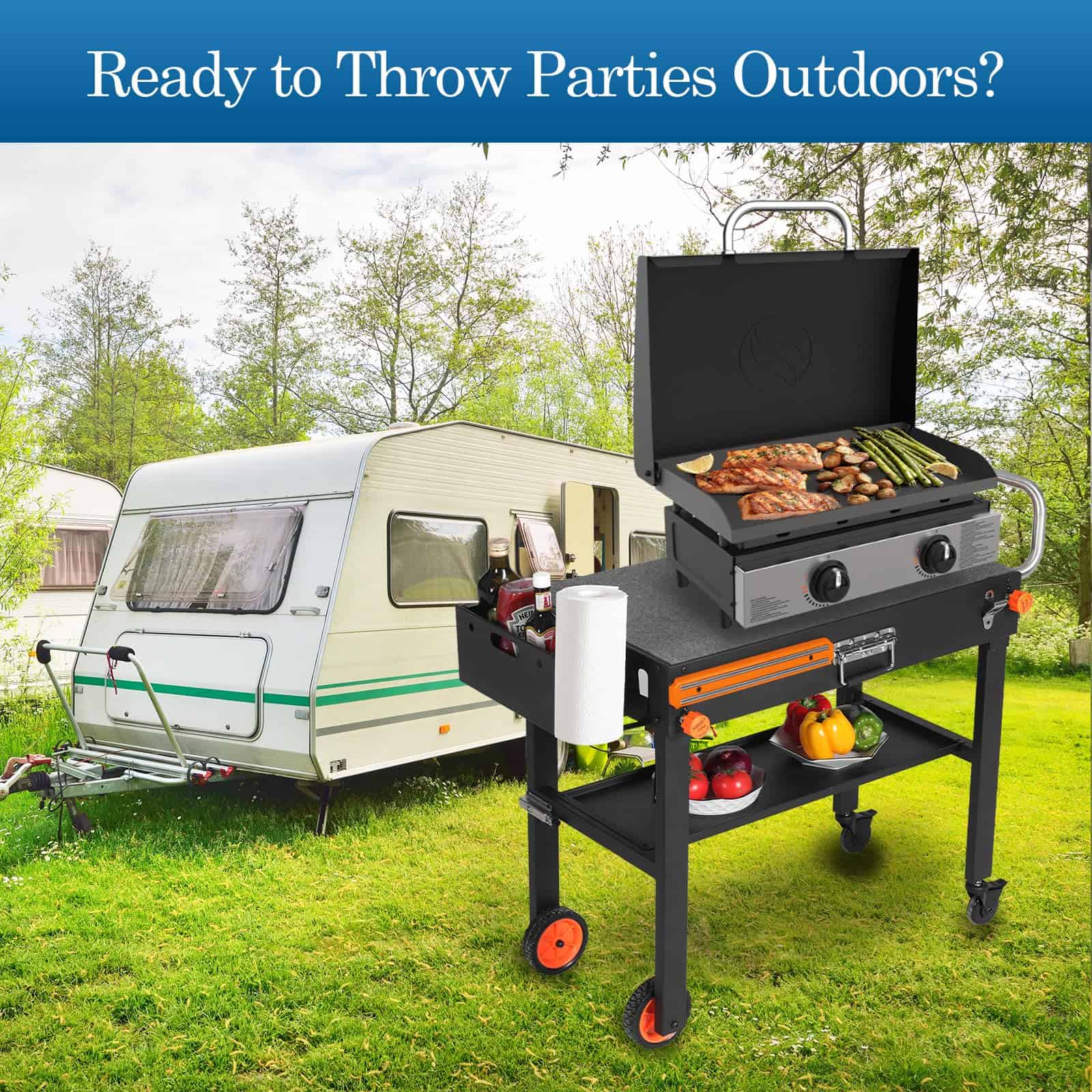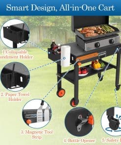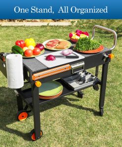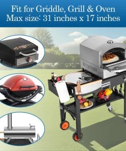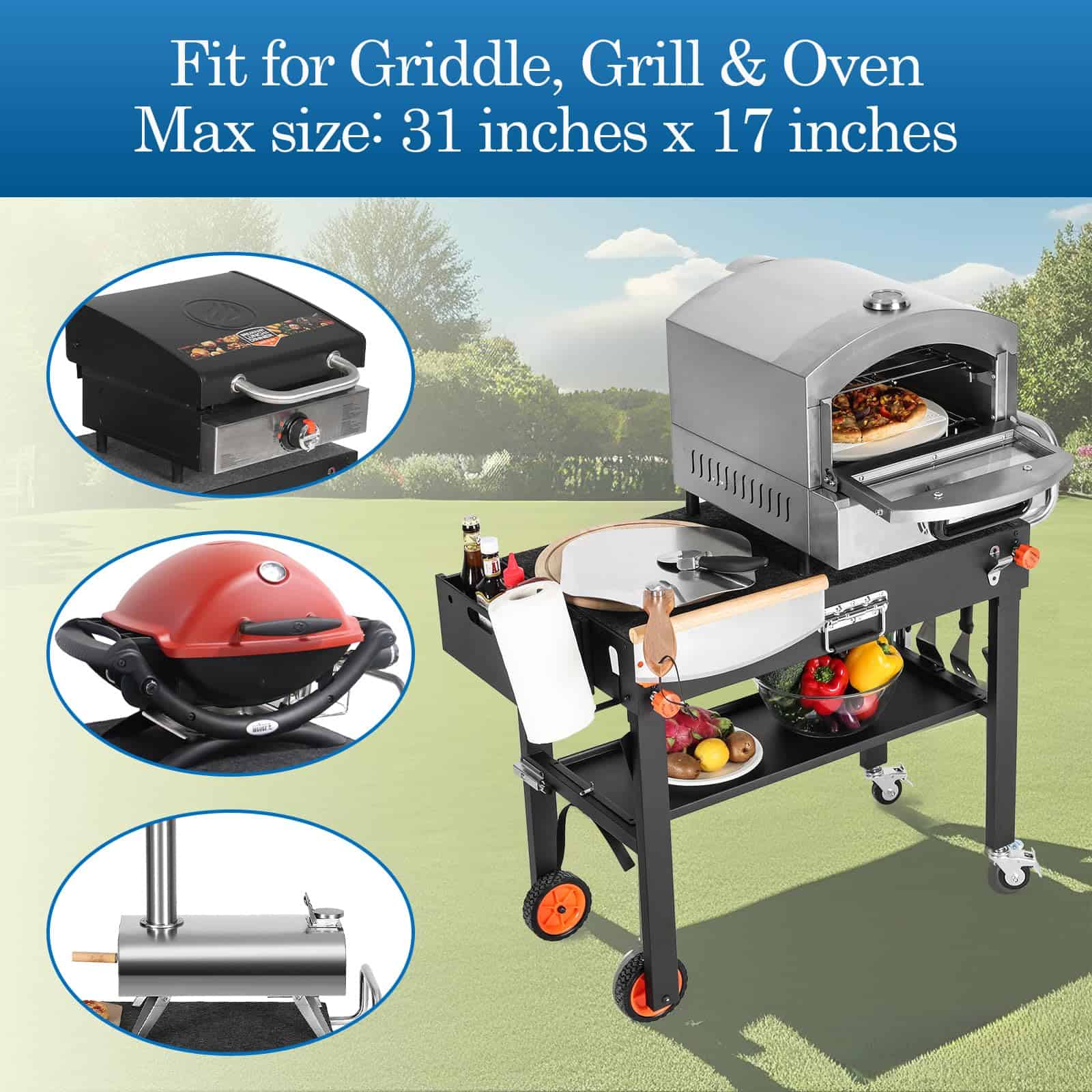 1. Diseño de carro de parrilla plegable universal diseñado para parrillas Blackstone de 17-22 pulgadas, hornos de pizza Ooni de 12 pulgadas, parrillas Ninja y más. Estantes dobles espaciosos proporcionan espacio adicional para herramientas, ingredientes y utensilios.