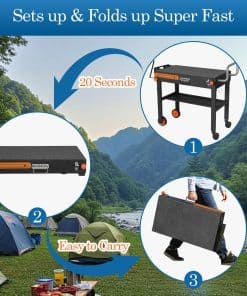 2. 20 segundos para armar y desarmar. ¡Pasa de una unidad portátil del tamaño de una maleta a una mesa de parrilla de tamaño completo en segundos! Simplemente despliega las patas de la mesa, bloquea los estantes y comienza a cocinar. Se pliega de la misma manera rápidamente para un almacenamiento compacto.