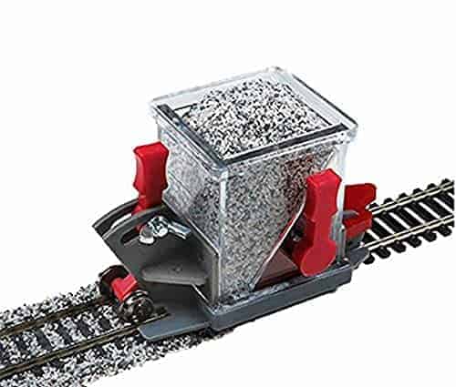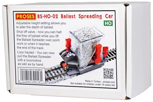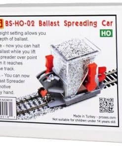 Carro esparcidor de lastre con cierre y ajuste de altura – Escala HO. Esparce lastre de manera fácil con esta práctica herramienta. Puede ser remolcado o empujado por tu locomotora para una aplicación uniforme y constante. El ajuste de altura te permite elegir el grosor/profundidad del lastre y se adapta a cualquier riel de código (código 100, 83, 75, etc.). La válvula de cierre te permite detener el flujo de lastre cuando deseas mover el esparcidor a diferentes áreas o cuando llega al final de la pista.