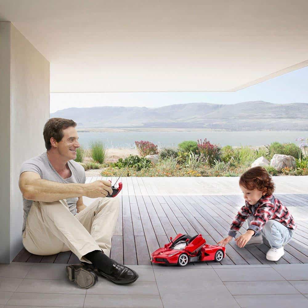 Vehículo de modelo a escala 1/14 de Ferrari a control remoto por RASTAR, oficialmente licenciado por Ferrari S.P.A. Escala 1:14 basada en los datos originales del verdadero Ferrari, altamente detallado en su interior y exterior: puertas de mariposa que se abren manualmente, luces delanteras y traseras funcionales, sistema de suspensión de muelles integrado, mecanismo diferencial. Tamaño: el coche mide 13.3″ x 5.9″ x 3.3″ / el control mide 5.4″ x 3.5″. Color disponible en Rojo. Funciones completas: adelante, reversa, detenerse, girar a izquierda y derecha; rango remoto de hasta 98 pies / 30 metros, velocidad de 5.1 mph / 8.2 km/h. Frecuencia disponible en 27.145 MHz o 40.680 MHz (opcional). Pilas no incluidas: requiere 5 pilas AA para el coche y 1 pila de 9V para el control. El paquete incluye: 1 x Coche a control remoto RASTAR 1/14, 1 x Control remoto de doble agarre, 1 x Guía de usuario.