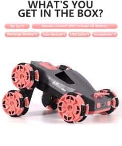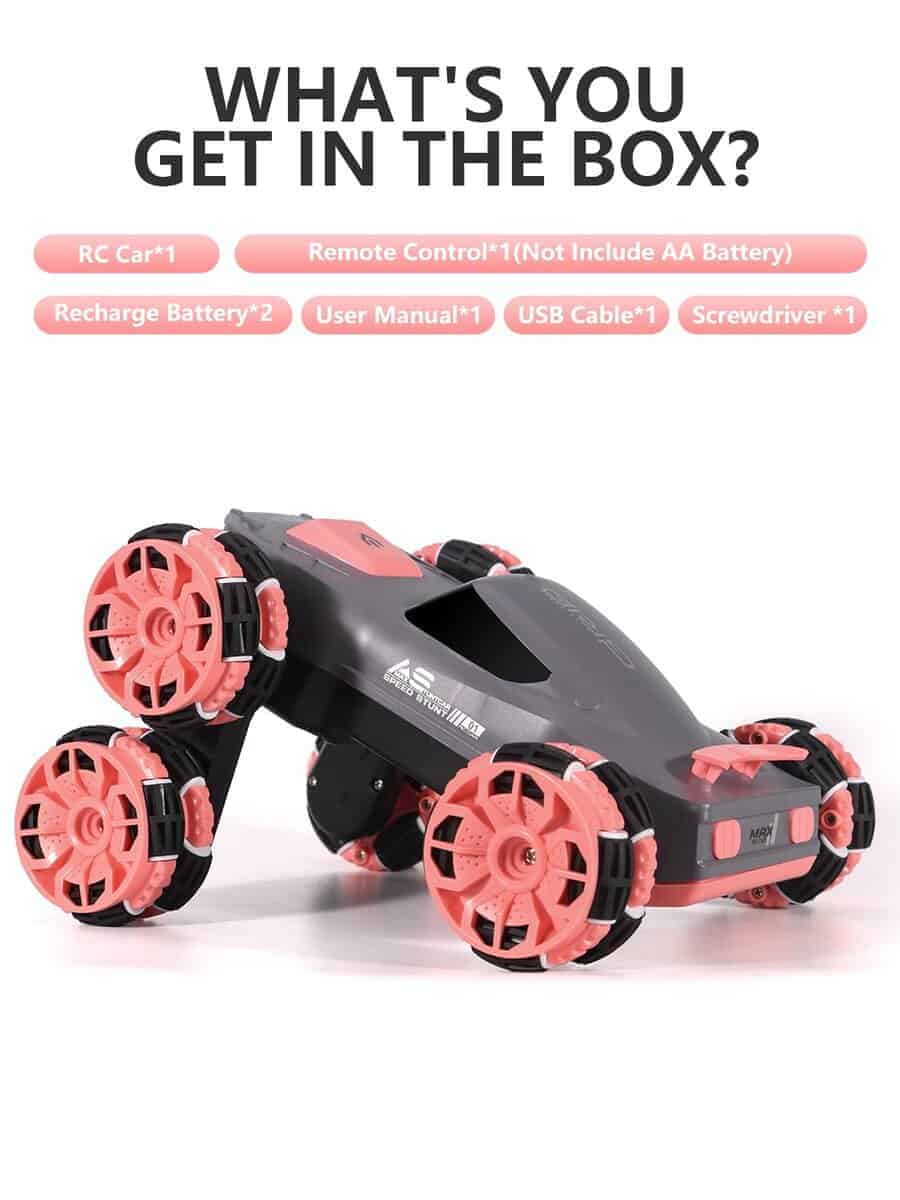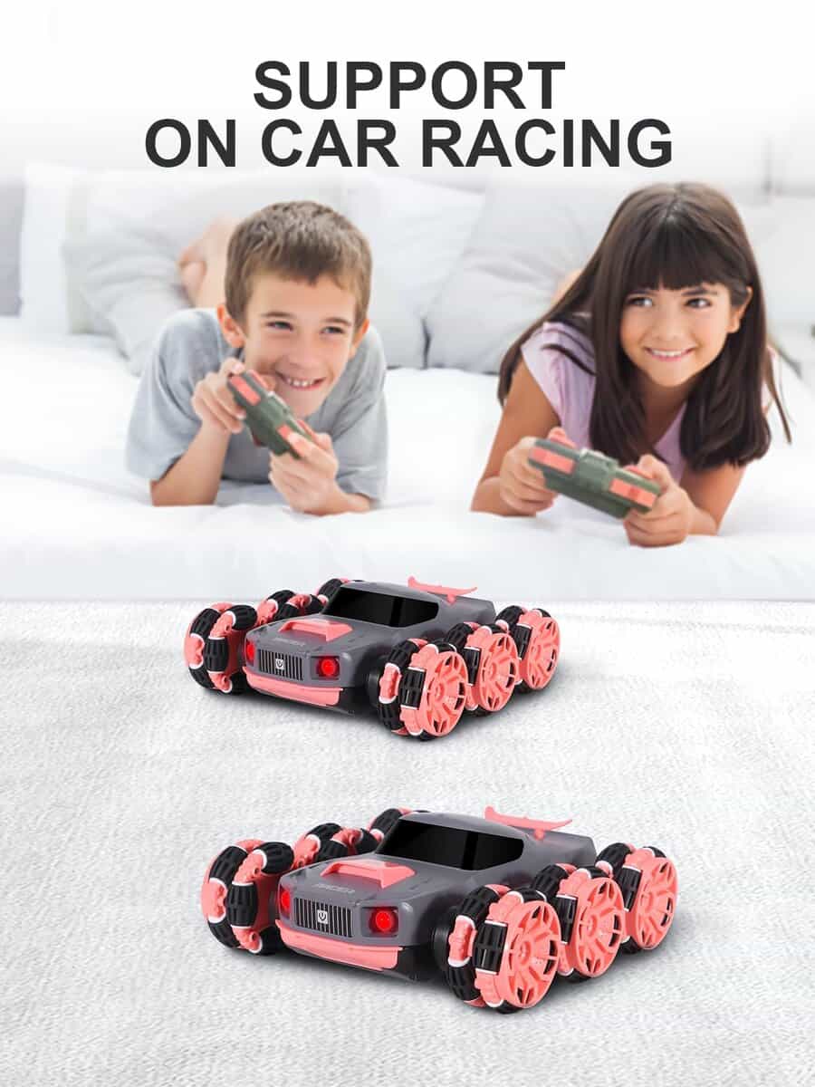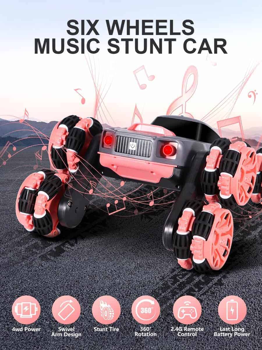 1. Coche de acrobacias de 6 ruedas: El diseño único puede realizar carreras, adelante, atrás, deriva de rotación de 360 grados e incluso balancear el brazo hacia adelante o hacia atrás. Compite con amigos, haz deriva, permite a tus hijos experimentar locas acrobacias todoterreno, brindándoles diversión interminable.
