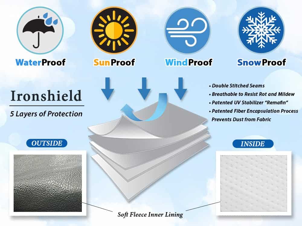 Ironshield protegerá su vehículo en casi cualquier tipo de clima inclemente. Estas fundas para autos cuentan con una capa exterior impermeable de vinilo de cuero con ventilaciones en la parte superior para permitir que la humedad acumulada durante el almacenamiento se libere y una capa interna suave para proteger contra los arañazos. Tiene la apariencia y sensación del cuero genuino.