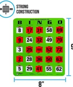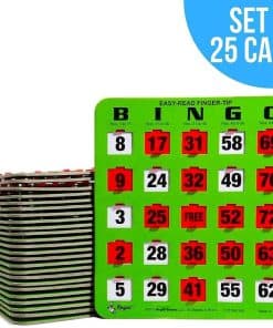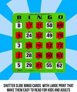 La noche de bingo acaba de volverse mucho más fácil con las Cartas de Bingo Regal Games Easy Read Jumbo Finger-Tip Shutter Slide. Con nuestras lujosas cartas de bingo con ventanas deslizantes transparentes de plástico rojo, un simple gesto del dedo marca el número y son excelentes adiciones a tu evento de bingo. Ideal para viajes en autobús, eventos escolares, picnics de empresa, reuniones familiares u otros lugares donde no desees molestarte con fichas o marcadores. Cada carta está hecha de cartulina duradera y mide 9 pulgadas x 8 pulgadas con grandes letras que las hacen fáciles de leer para niños y adultos. Desde hace décadas, Regal Games ha estado llevando entretenimiento de diversión familiar a una nueva generación de amantes de juguetes y juegos. El Fundador de Regal Games, Erich Spitzner, cambió para siempre la cara del Bingo con su invención de las cartas de bingo con ventanas de estor. Desde esa invención original, nuestros productos están diseñados para ser fáciles de usar y brindar un gran valor a las familias para llevar sonrisas y horas de diversión.