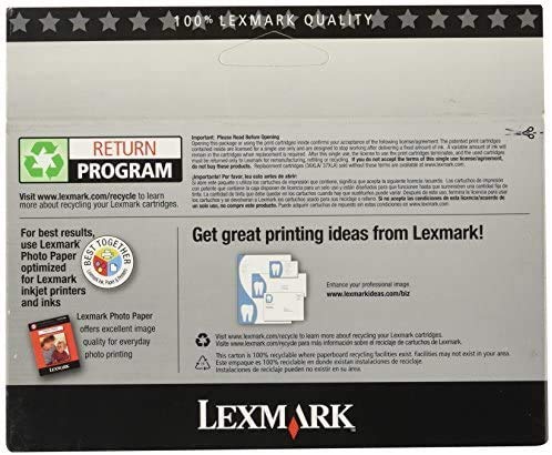 Los cartuchos de tinta de alto rendimiento están diseñados para usar con Lexmark x3650, x4650, x5650, x5650es, x6650, x6675 y Z2420. La tecnología de gota de tinta de tamaño variable permite una calidad de imagen más vívida y precisa. Los altos rendimientos significan que estás ahorrando mucho al funcionar con la mejor eficiencia, tanto para tu presupuesto como para el medio ambiente. El cartucho no rellenable está autorizado para un solo uso. Los cartuchos del Programa de Devolución de Lexmark se venden con descuento en comparación con los precios de los cartuchos regulares, a cambio de que el cliente se comprometa a usar el cartucho solo una vez y devolverlo solo a Lexmark para su remanufacturación o reciclaje. El paquete doble incluye un cartucho negro no. 36XL y un cartucho de color no. 37XL. Cada cartucho rinde aproximadamente 500 páginas.