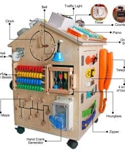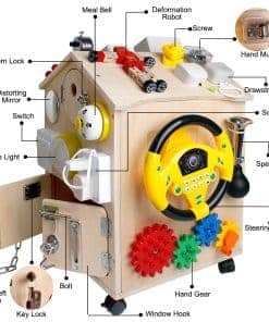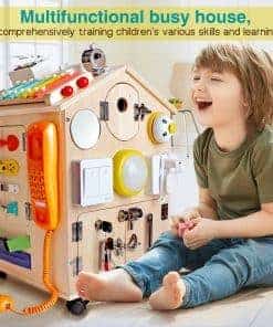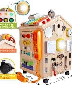 Casa de Madera Montessori SHIERDU para Entrenamiento de Habilidades Básicas de Vida y Motricidad Fina para Niños, Educación Preescolar y Juegos de Aprendizaje, Juguetes Sensoriales, Regalos Grandes para Niños y Niñas. Este juguete de aprendizaje es un centro de actividades divertido que incluye una variedad de elementos como trompos, semáforos, campanas, cajas de música manuales, xilófonos, juguetes de tuerca, relojes de arena, ábacos para niños, pestillos, hebillas de metal, puertas, relojes, robots, ruedas, interruptores, enchufes, teléfonos, volantes, relojes, espejos, mini generadores, xilófono, cerradura con llave, entre otros. El diseño exquisito de la casa ocupada la hace más atractiva para niños de todas las edades, con cuatro ruedas móviles con cerraduras y una gran sala de almacenamiento. La educación temprana de estilo Montessori promueve el aprendizaje práctico, habilidades de autoensamblaje, colores, matemáticas, formas y habilidades de resolución de problemas, así como el desarrollo de habilidades motoras finas. Además, este juguete puede ayudar a los niños a familiarizarse con las cosas cotidianas, ejercitar su imaginación y creatividad. Es un regalo ideal para entretener y educar a los niños en casa, manteniéndolos entretenidos durante horas. Perfecto para reuniones familiares o fiestas, puede acomodar de 1 a 4 niños para jugar al mismo tiempo. Se puede utilizar como material didáctico en guarderías y también como regalo de cumpleaños o en festividades importantes como Navidad, Acción de Gracias y Pascua. La mansión está fabricada con materiales sólidos y mano de obra de calidad, cumple con las normas de seguridad infantil y su montaje es muy sencillo.