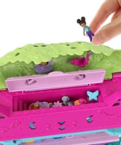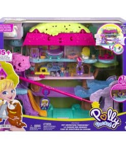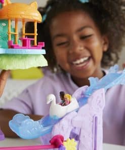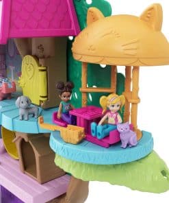 ¡El conjunto de juego Casa de Aventuras para Mascotas Polly Pocket Pollyville está lleno de diversión y actividades para las mascotas! ¡Hay un total de CINCO pisos para jugar, más una forma única de expandir el conjunto de juego para convertirlo en la máxima gran casa de árbol! Incluidas están las muñecas Polly y Shani, 4 adorables figuras de animales, 9 accesorios para diversión en la fiesta de mascotas y 1 vehículo cisne. La acción comienza al conducir el vehículo cisne sobre el tope de velocidad para expandir el conjunto de juego y activar una tirolina, además de conducir sobre un segundo tope de velocidad para expandir el tobogán de la cascada. Los niños pueden explorar sorpresas ocultas y espacios de juego en cinco pisos y en áreas como el tobogán de escape oculto en la casa del perro, mirador en la copa de los árboles, área de escalada en roca, paseo en globo aerostático, balancín de cesta, almacenamiento secreto y más. Los colores y decoraciones pueden variar. Es un gran juguete para niños de 4 años en adelante.