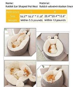 Especificaciones Nombre: Nido para Mascotas con Orejas de Conejo Material: Terciopelo de conejo + lino de algodón imitación Tamaño: Pequeño (16.5 x 16.5 x 11.8 pulgadas), Mediano (20.1 x 20.4 x 12.6 pulgadas) Condición: 100% nuevo Características 1. El interior del nido para mascotas está relleno con suficiente algodón PP tridimensional, por lo que es lo suficientemente grueso como para no colapsar fácilmente 2. El nido para mascotas está hecho de material de terciopelo de conejo, que es cómodo y agradable a la piel, suave y liso, como si estuviera acostado en algodón de azúcar, permitiendo que tu mascota duerma cómodamente toda la noche 3. El cojín se puede desmontar para la limpieza, lo que lo hace más limpio y más higiénico. Dale a tu mascota una cama pequeña cómoda y limpia