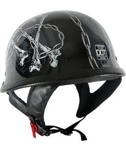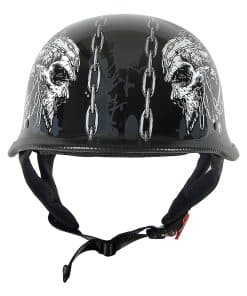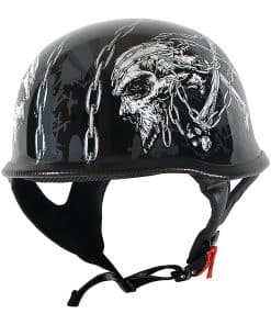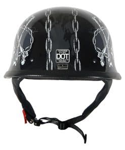 Casco de media cara para motocicleta 1Storm Novelty Open German Style DOT Approved: HKY602 Chain Skull. Este casco ha sido aprobado por DOT y cuenta con un diseño novedoso en estilo alemán. Fabricado con una carcasa de aleación termoplástica aerodinámica resistente y ligera para una mayor protección. Presenta un acabado brillante de protección UV que lo hace lucir hermoso. El acolchado es removible y lavable para mayor comodidad, y la hebilla de liberación rápida facilita su colocación y retiro. Talla L (59-60 CM, 23.2/23.6 pulgadas). ¡Protege tu cabeza con estilo en tus viajes en motocicleta!