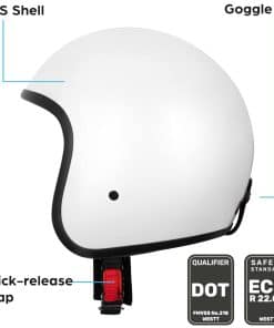 3. Ajuste perfecto y uso fácil El casco de motocicleta de cara abierta Westt obtiene el ajuste óptimo a partir de la carcasa de policarbonato ligero con correas de barbilla reforzadas para un viaje cómodo y seguro en todo momento. Con la correa de barbilla ajustable y la hebilla de liberación rápida, incluso al usar guantes maximice la comodidad de uso.