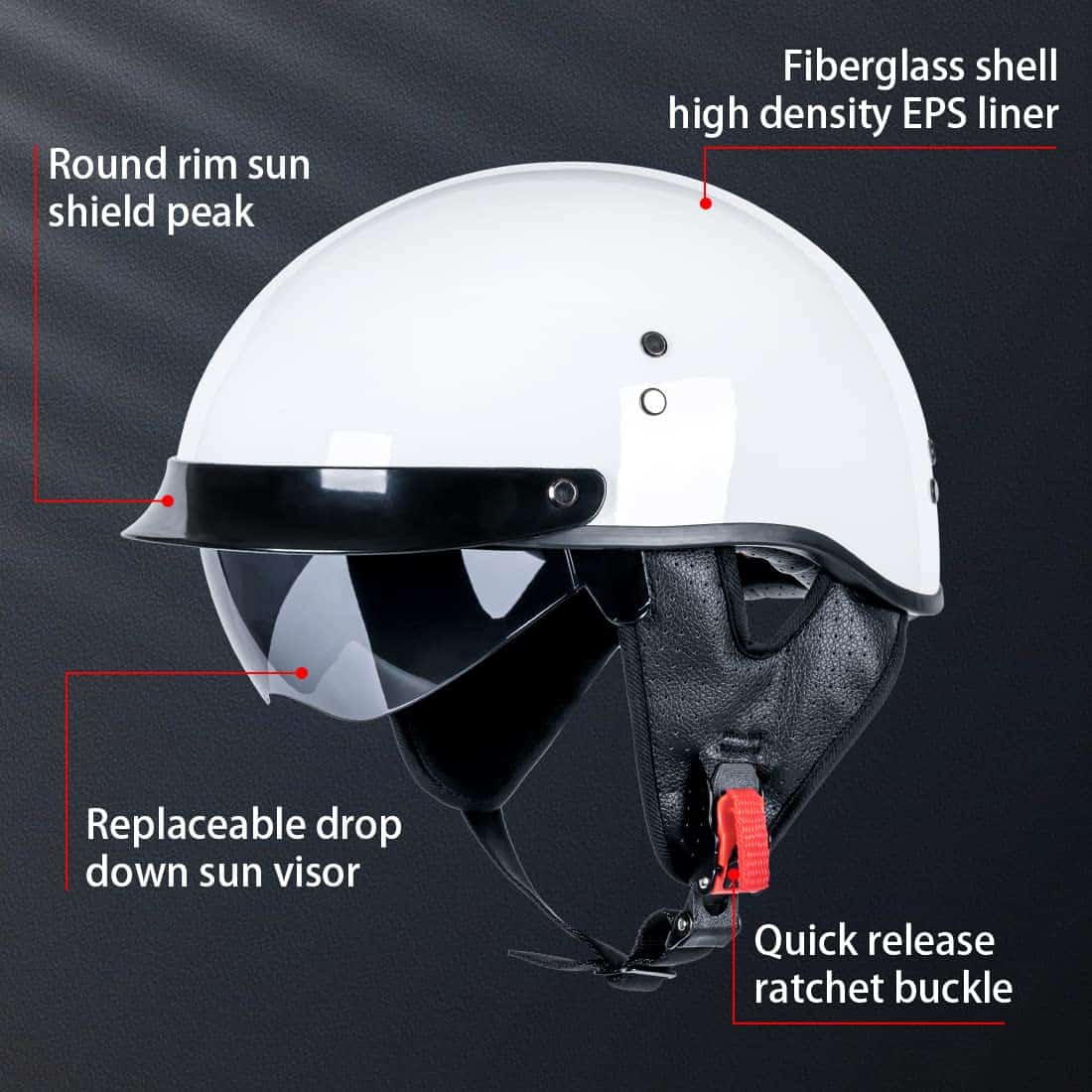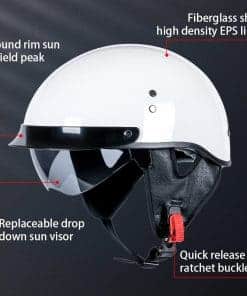1. Material de Fibra de Vidrio Compuesto: Casco de motocicleta medio con material de fibra de vidrio reforzado, ligero y resistente a impactos. Es seguro, duradero, resistente a la temperatura y a la edad, y es más fuerte en comparación con el material de ABS.