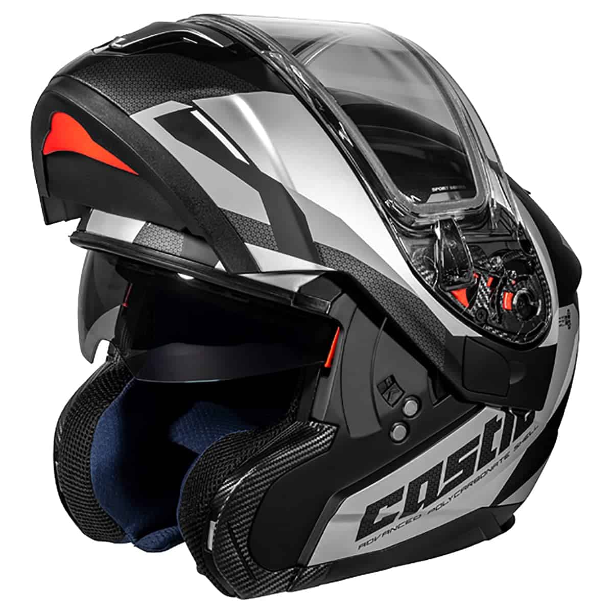 SNOW configuration incluye escudo de doble capa, visera de sol tintada, caja de respiración y cortina para clima frío. Casco modular diseñado con acción de botón único para levantar la barbilla. Diseño de carcasa aerodinámica y moderna creado con tecnología CAD. Carcasa construida con moldeo por inyección de compuesto de policarbonato avanzado. Forro EPS de múltiple densidad incluyendo colocación en laterales de la barbilla. Escudo de doble capa ópticamente correcto con recubrimiento resistente utiliza un sistema de reemplazo de escudo de liberación rápida. Sistema de visor solar desplegable amigable para el conductor, equipado de serie con visor de sol tintado. Aprobado por DOT y ECE. Sistema de acolchado interior removible ofrece un ajuste lujoso. Almohadillas de mejillas amigables con gafas. Compatible con sistema de comunicación. Sistema de hebilla de correa de barbilla de liberación rápida ofrece ajustes para comodidad segura. Sistema de ventilación avanzado permite que el aire fluya fácilmente de adelante hacia atrás en el casco para eliminar el exceso de calor a través de los canales de flujo de aire en el forro EPS. Caja de respiración removible/reemplazable y cortina para clima frío. Escudos opcionales y visores de sol se venden por separado. Aprobado por DOT. Cumple con el Estándar FMVSS 218.