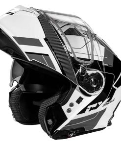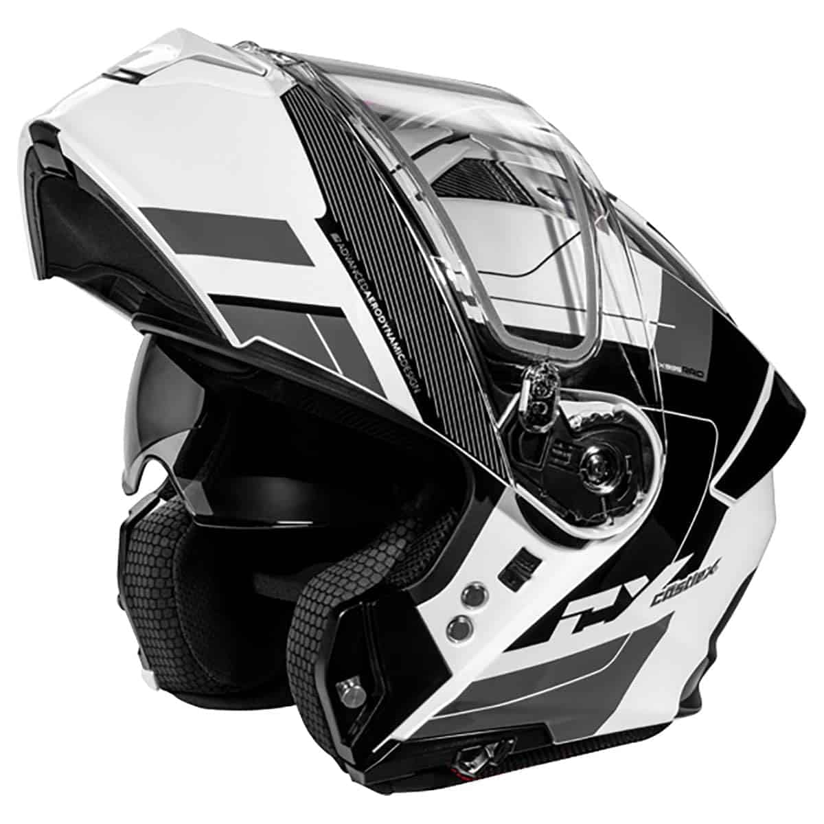 2. Diseño de casco modular utiliza acción de un solo botón para levantar la barra de la barbilla.