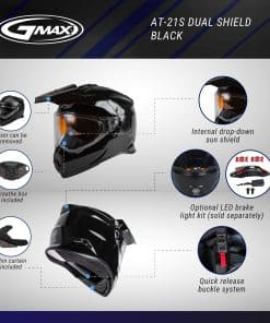 GMAX se complace en presentar el nuevo AT-21 diseñado competitivamente desde cero. Aquí tienes tu próximo casco de turismo de aventura. El AT-21 está construido con una carcasa de policarbonato ligera que ofrece una protección superior y supera las certificaciones de seguridad DOT y ECE. Este casco se fabrica en 3 tamaños de carcasa, desde jóvenes hasta adultos, ofreciendo una carcasa ligera para cualquier aventura. Internamente, el casco está equipado con un protector solar interno, interior Coolmax y bolsillos para altavoces empotrados para sistemas de comunicación. El interior extraíble con tecnología de núcleo Coolmax absorbe la humedad lejos del cuerpo y está diseñado para mantenerte seco y cómodo durante tu viaje. Disfruta de tu aventura con el nuevo AT-21 de GMAX, aprobado por DOT y cumple con el estándar FMVSS 218