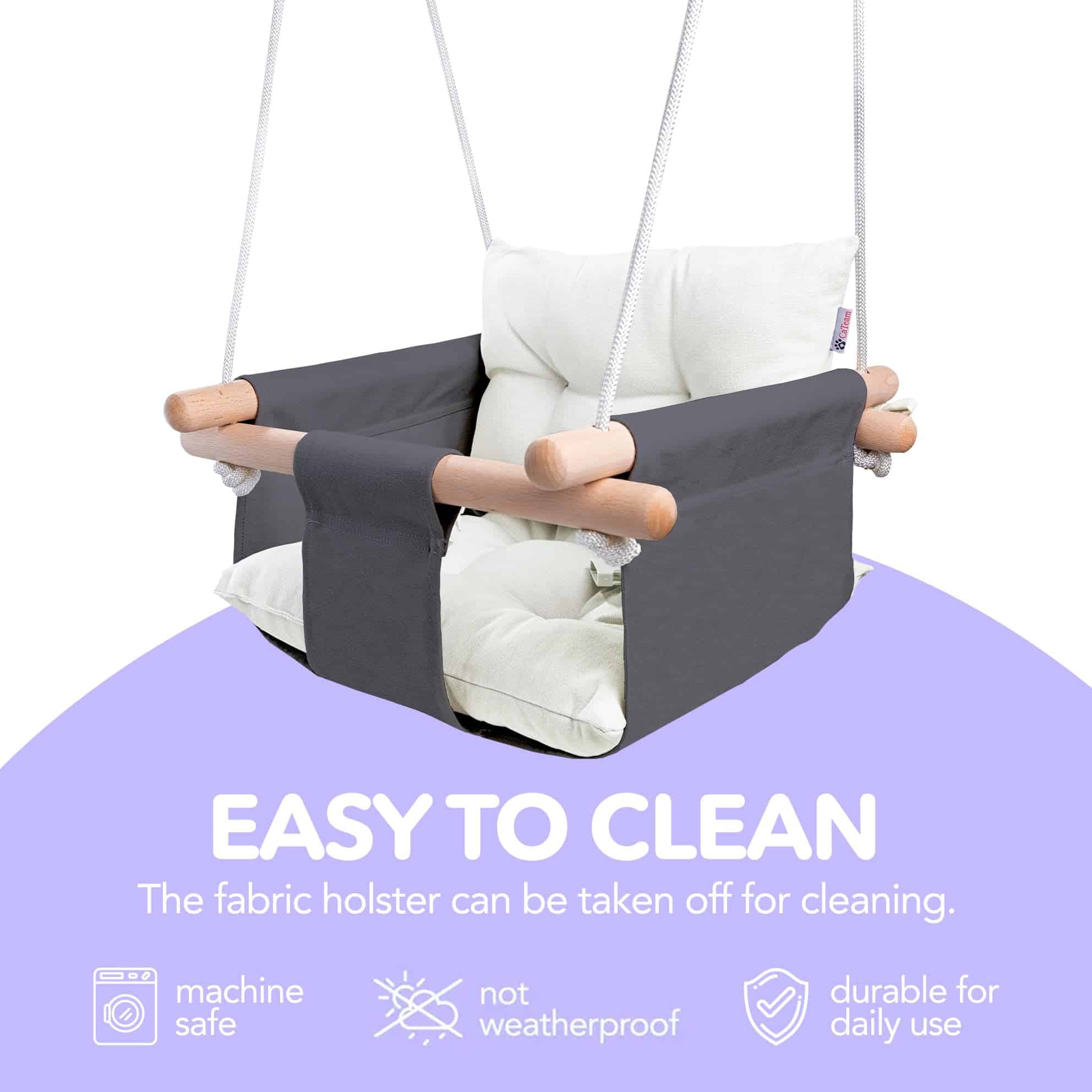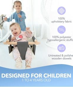 2. Extra Acolchonado – Utilizamos varillas de madera sin tratar y pulidas para nuestros columpios para niños. La silla colgante cuenta con tela de tapicería suave y 2 almohadas con relleno de poliéster apto para la piel, que puedes colocar juntas para mayor comodidad.