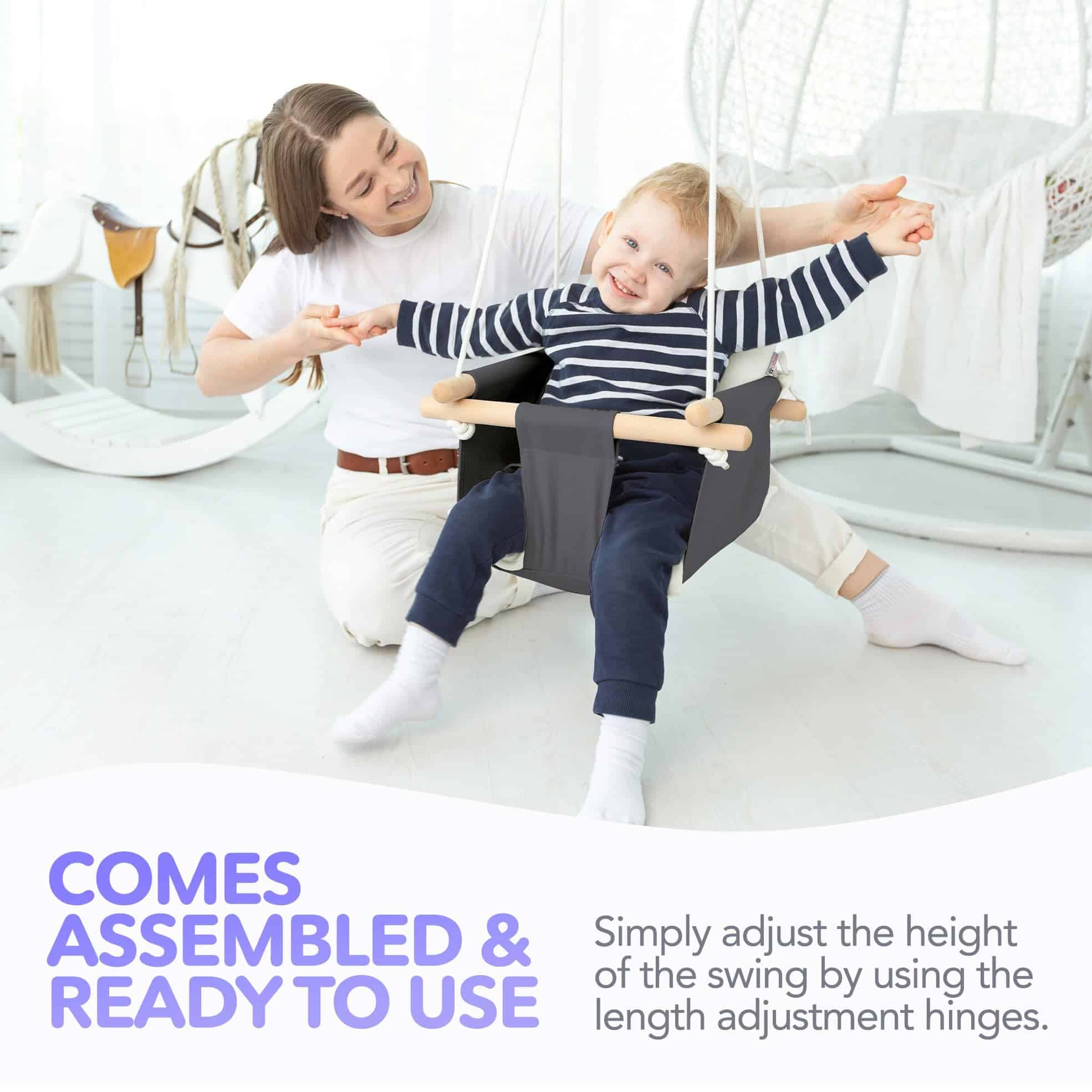 5. Viene Totalmente Ensamblado – ¡Olvídate de las largas horas de montaje con este set de columpio de bebé listo para usar! Está diseñado con un sistema de ajuste de altura simple. Antes/después de la instalación, solo necesitas ajustar la longitud de las cuerdas a tu altura preferida.
