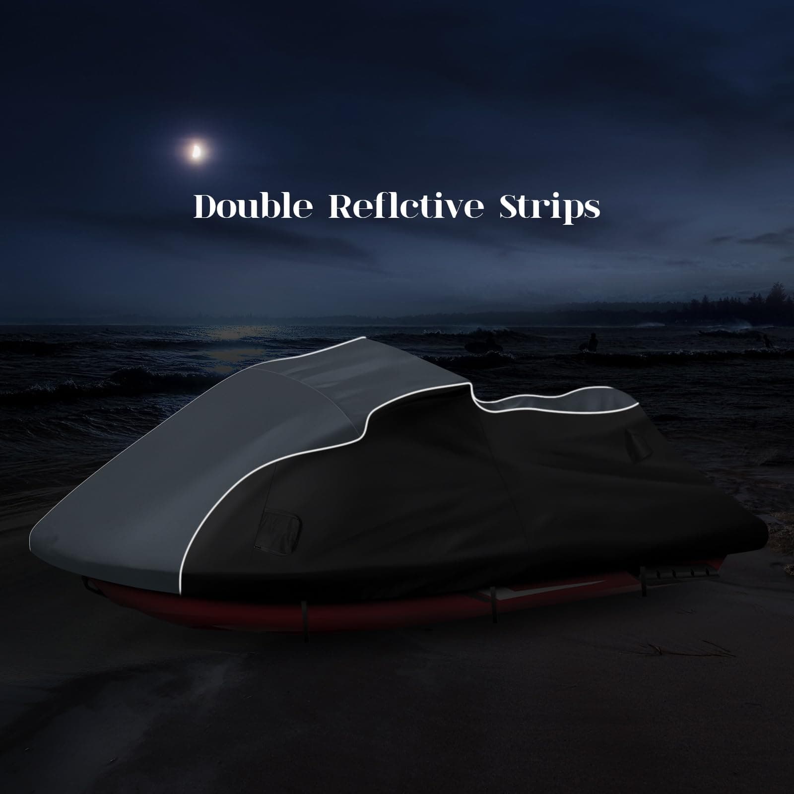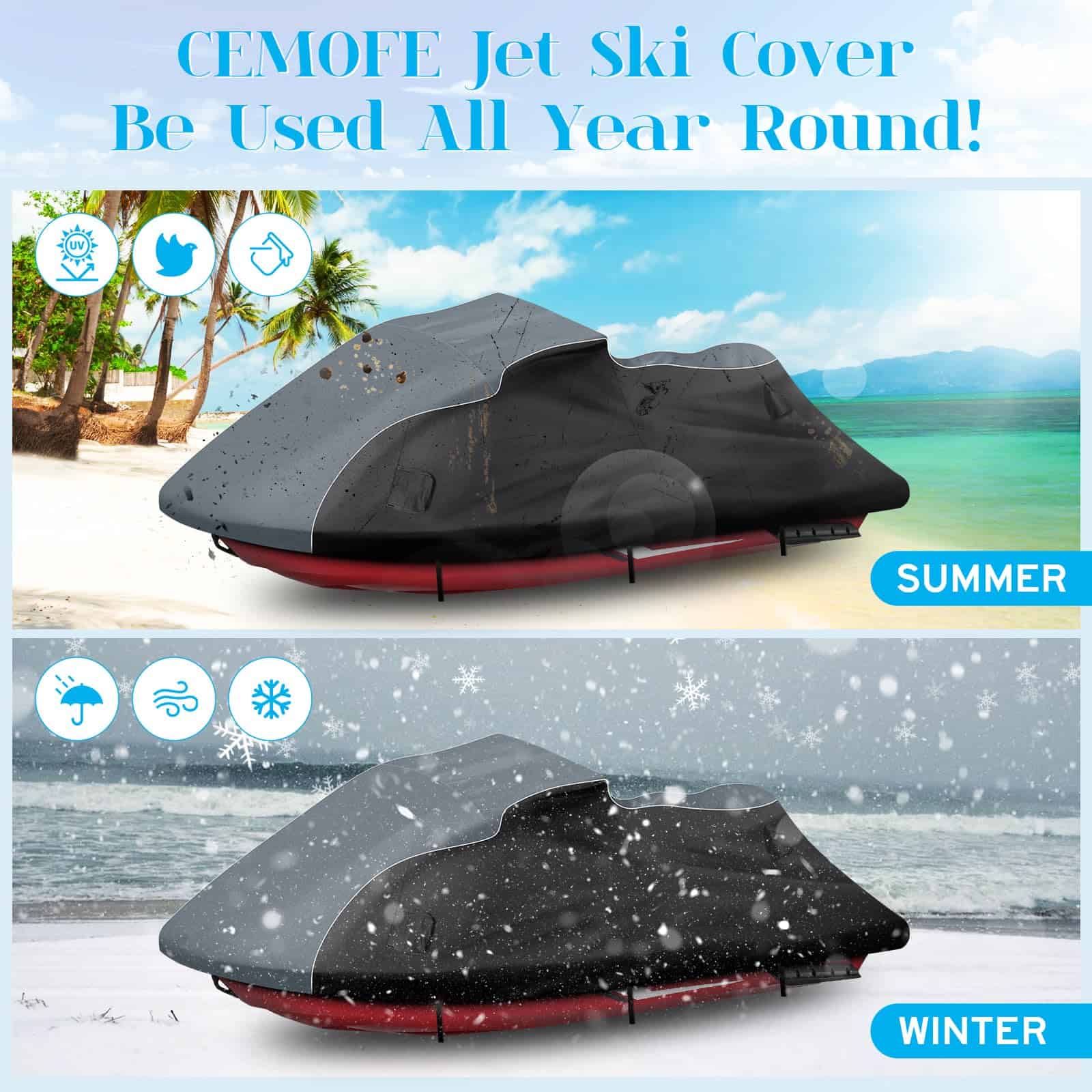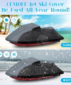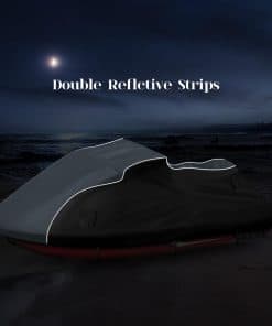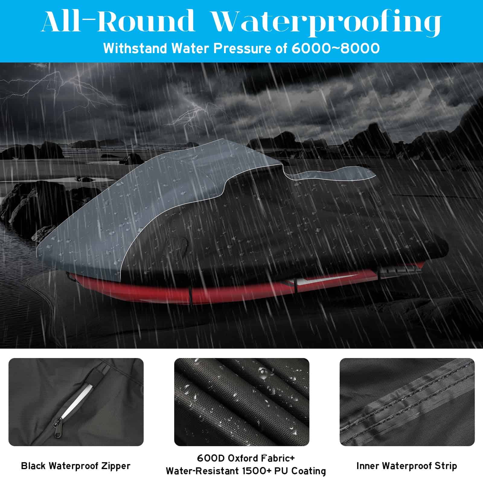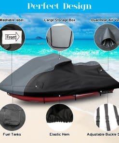 3. Impermeabilización Mejorada: Nuestra funda para jet ski cuenta con un revestimiento de PU impermeable y un diseño de tira de compresión impermeable de doble costura para prevenir la infiltración de agua de lluvia. La cremallera impermeable negra mejorada es suave y duradera, fácil de abrir y cerrar.