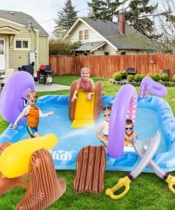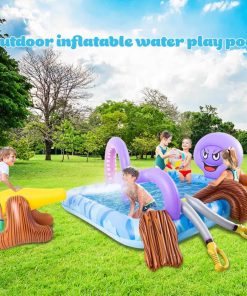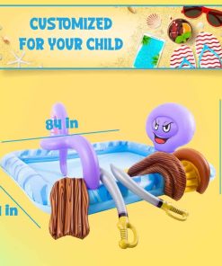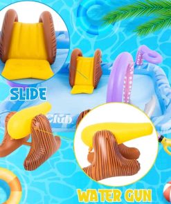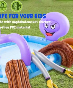 1. Juego valioso: Recibirás un set de piscina inflable temática de pulpo que incluye 1 base de piscina, 1 tobogán, 2 espadas, 1 bloque de madera y 1 cañón.