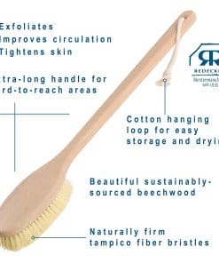 1. Cerdas Firmes: Las cerdas extras firmes de fibra de tampico mejoran la circulación mientras eliminan las células muertas y secas de la piel. 2. Mango Extra Largo: Este cepillo de ducha de mango largo es ideal para frotar la espalda y otras áreas de difícil acceso, este cepillo de baño de mango largo para uso en la ducha cuenta con un lazo de algodón para un almacenamiento conveniente. 3. Madera de Haya Hecha a Mano: El cepillo de cuerpo y espalda de mango extra largo, fabricado con madera de haya aceitada natural, asegura durabilidad para el uso diario. El cepillo de espalda de fibra de tampico mide 19-1/2″ de largo. 4. Cuidado Adecuado: Para mantener la calidad, enjuague con agua tibia y jabón suave, seque con una toalla y deje secar al aire a temperatura ambiente. 5. Mantenimiento Opcional: Para evitar grietas, frote periódicamente con aceite de girasol o de linaza usando un trapo suave o tejido. La re-aplicación regular de aceite revitaliza la madera, mejora la durabilidad y previene la aparición de astillas, especialmente para artículos expuestos frecuentemente al agua.