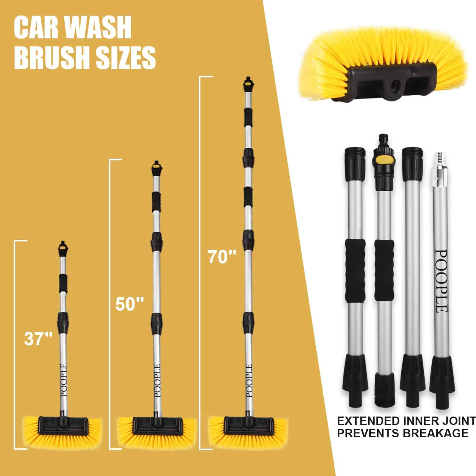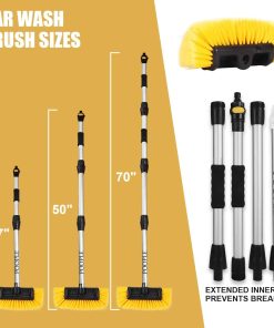 4. Tamaños Ajustables y Control Antideslizante Puede ensamblar libremente los 4 postes para hacer que la longitud del mango extensible vaya de 16″ a 70″ para diferentes usos. Y el cepillo de coche ensamblado con mango largo puede llegar hasta 70 de largo, lo que facilita llegar desde el borde inferior de su coche hasta la parte superior de los techos de los vehículos. También cuenta con dos agarres de espuma para un control adicional. Puede sostener bien el poste incluso si su mano está mojada o resbaladiza.
