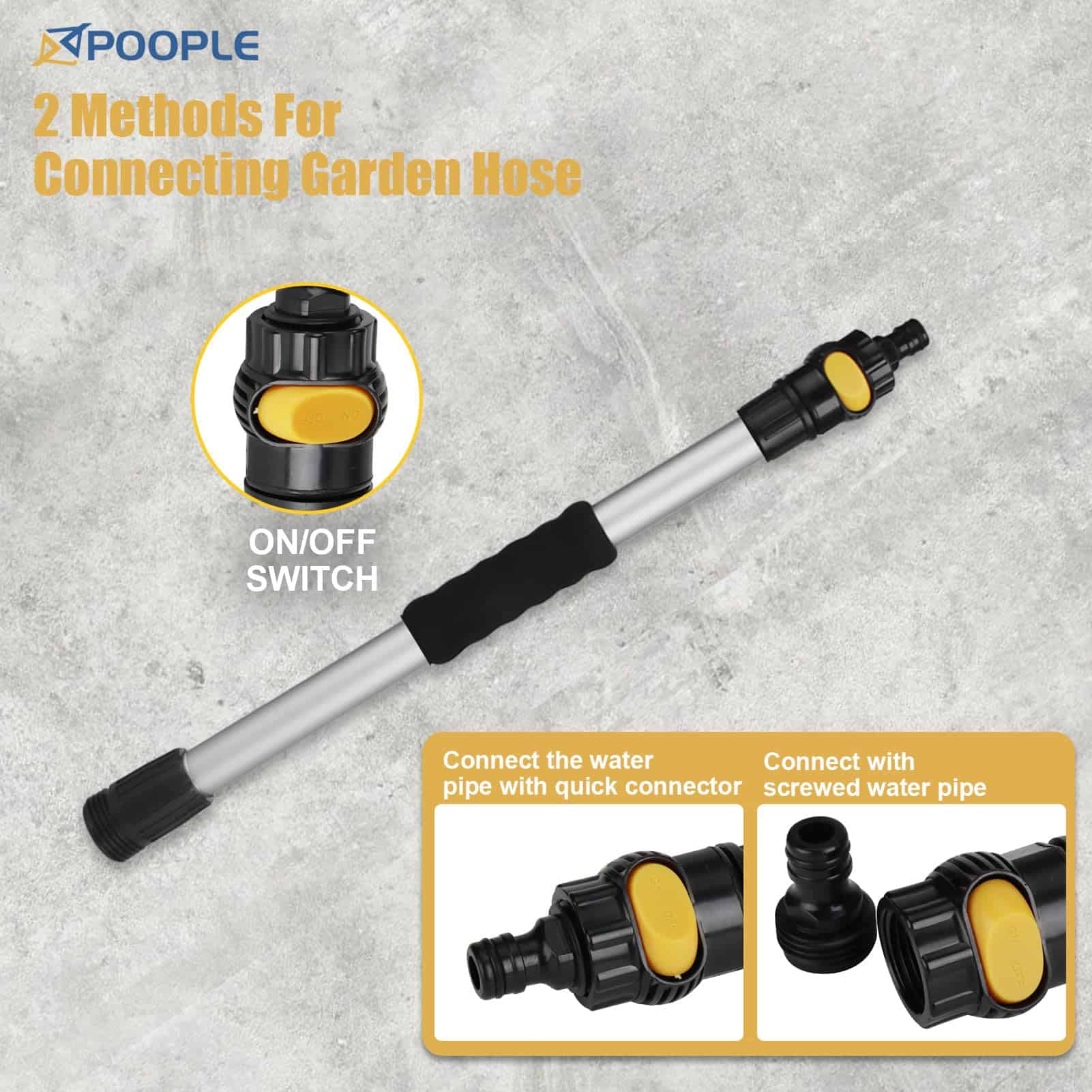 3. Conectividad de Cepillo de Inmersión para Lavado de Autos – El cepillo de lavado exterior para rv de POOPLE viene con un adaptador con interruptor de agua encendido / apagado que se puede conectar a una manguera de jardín de 2 formas, una es con el extremo del adaptador y la otra es sin el extremo del adaptador. Asegúrese de que la parte de conexión tenga una junta tórica para evitar fugas.