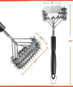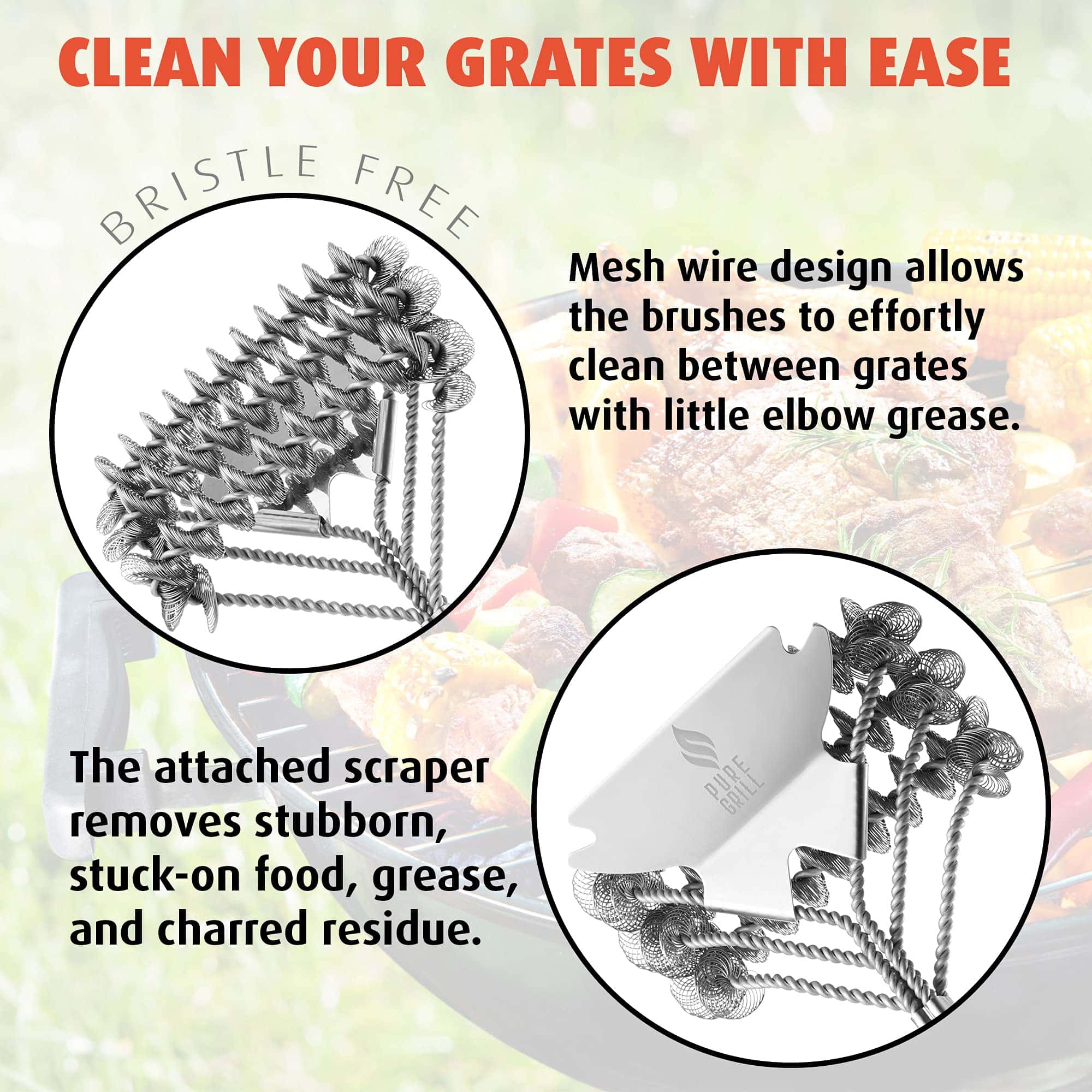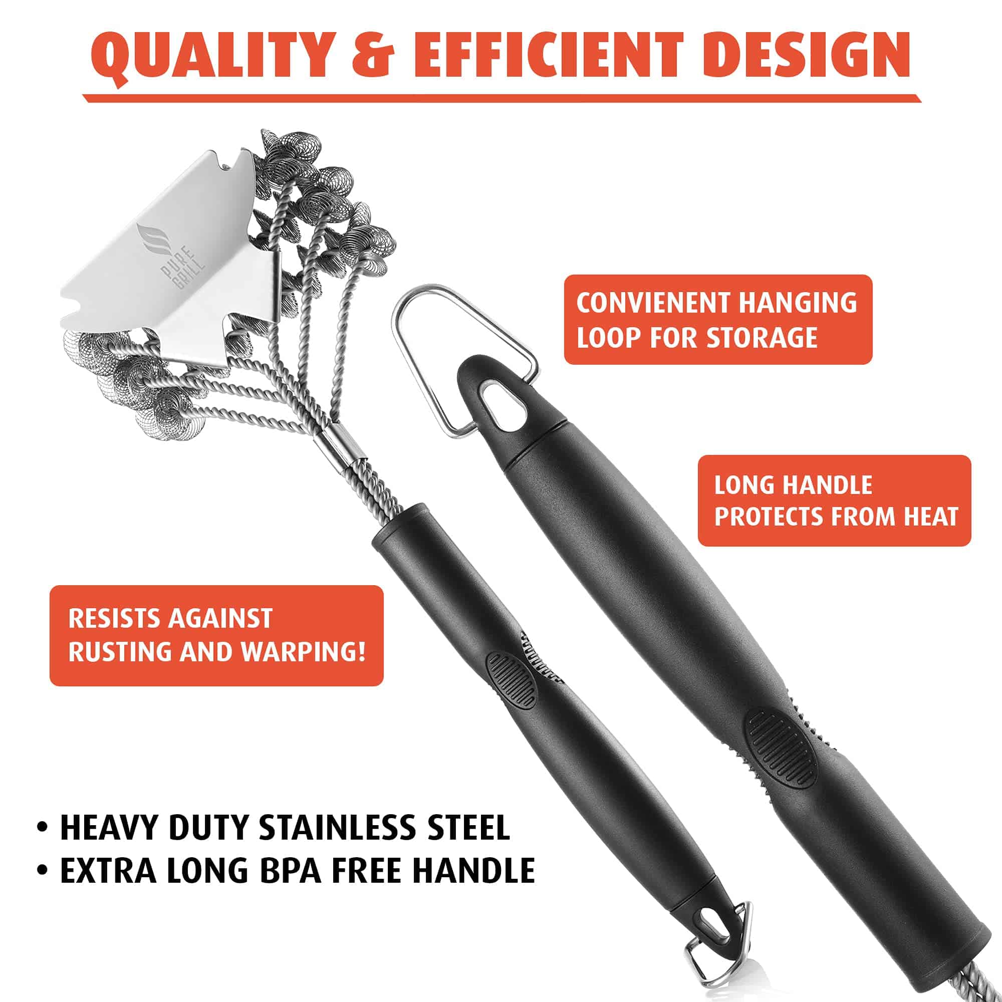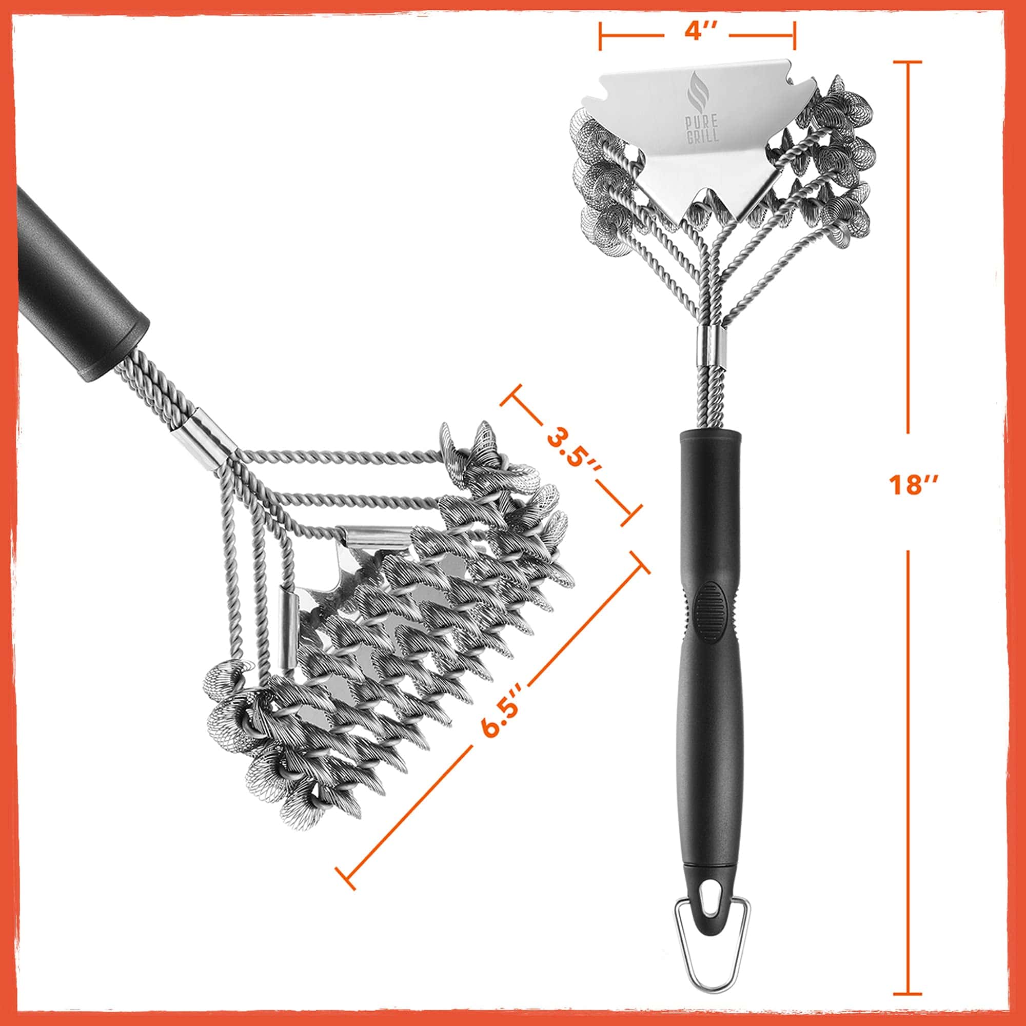 2. 3-en-1, raspador incorporado: Mantenga sus rejillas de parrilla como nuevas limpiándolas con este cepillo de parrilla y raspador de Pure Grill. Tres cabezales de cepillo con cable duro limpian profundamente al deslizarse sobre las rejillas de la parrilla. El diseño de malla de alambre permite que los cepillos limpien sin esfuerzo entre las rejillas con poco esfuerzo. El raspador extra largo adjunto elimina fácilmente la comida, grasa y residuos carbonizados obstinados, dejándote con una parrilla limpia cada vez.