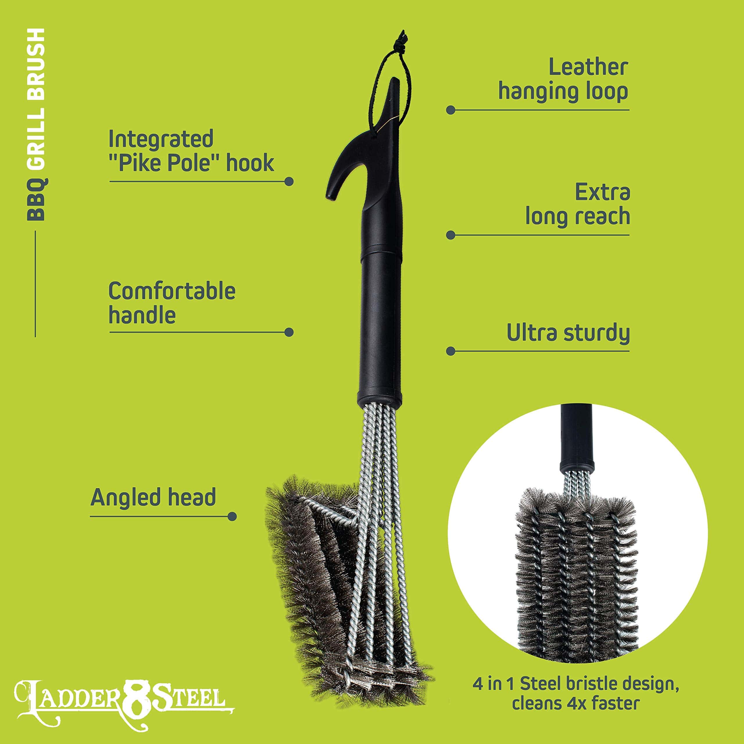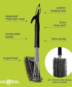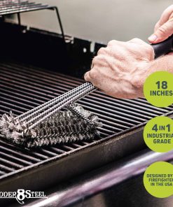 1. ¡CEPILLO DE PARRILLA SEGURO: Limpie su barbacoa con confianza y cuidado al usar nuestro limpiador de parrillas seguro! Ya sea que tenga una parrilla de latón, porcelana, cerámica, cobre, sin metal o infrarroja, este cepillo de limpieza de parrilla eliminará cualquier grasa cocida!. 2. ¡PROBADO POR BOMBEROS: Este duradero y eficaz cepillo limpiador de parrillas está aprobado por personas que saben cómo manipular las superficies calientes de la mejor manera: ¡bomberos! Nuestro cepillo limpiador de parrillas puede manejar incluso las rejillas de parrilla más sucias y dejarlas súper limpias. 3. ¡CEPILLO PARA PARRILLA DE ALTA CALIDAD, 4 EN 1, DE SERVICIO PESADO: Hecho con 4 cepillos de acero inoxidable para limpiar cualquier rejilla de manera completa y segura. Cuatro filas limpian más rápido que tres y resisten doblarse cuando le pones algo de esfuerzo. El mango extendido de 18 pulgadas está soportado con acero trenzado que garantiza una herramienta resistente de limpieza de parrilla. 4. ¡CEPILLO DE PARRILLA DE ALAMBRE FÁCIL DE USAR: Nuestro limpiador de rejillas fácil de usar es simple y eficaz. Simplemente deslice el cepillo de la parrilla de barbacoa a través de las rejillas y la parrilla, y deje que el cepillo haga el resto. El gancho al final del mango se puede utilizar para colgar el cepillo para un fácil almacenamiento. 5. ¡HECHO PARA AÑOS DE DISFRUTE DE BARBACOAS: Nuestro limpiador de parrillas probado y aprobado por bomberos está construido para durar, y ofrecemos una garantía de satisfacción del 100%. ¡Este cepillo para parrilla te durará incontables tardes, permitiéndote cocinar aún más hamburguesas y salchichas!