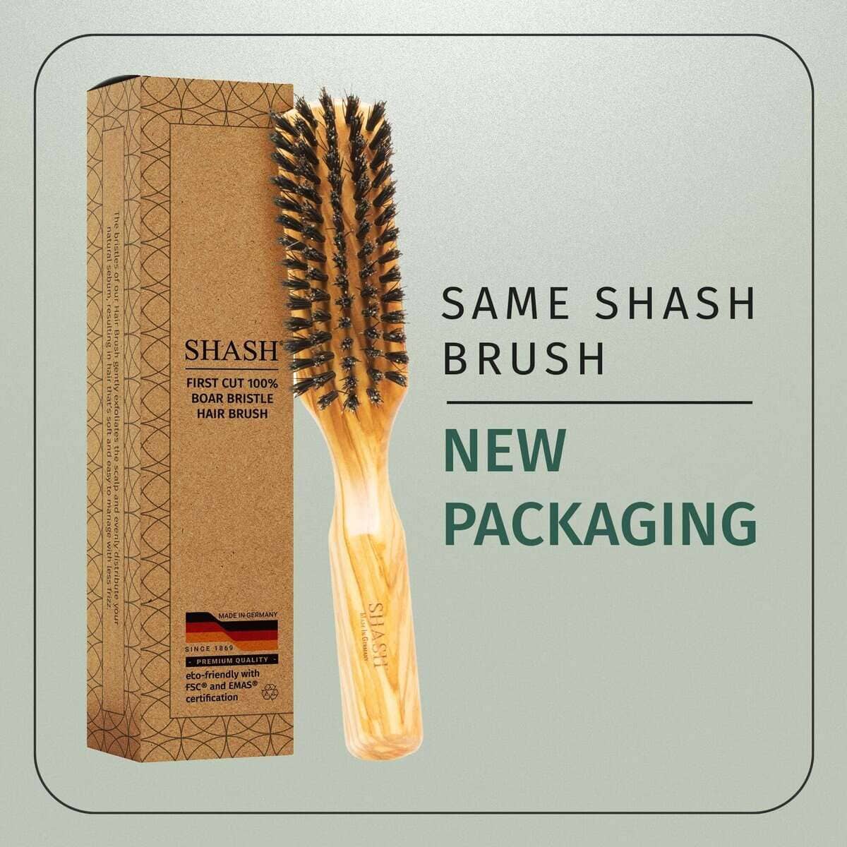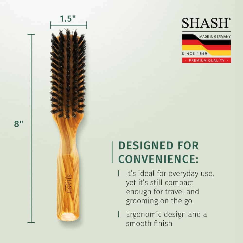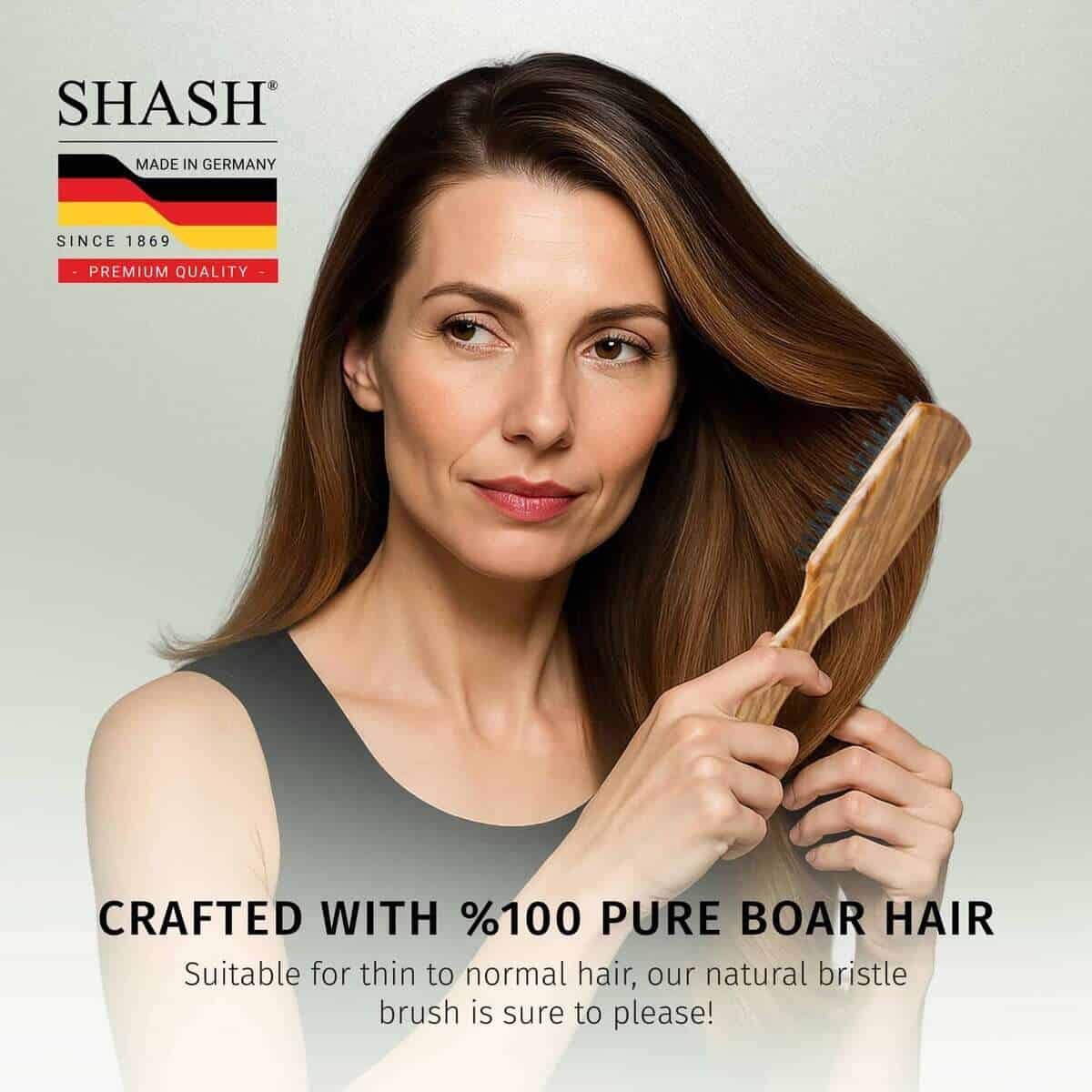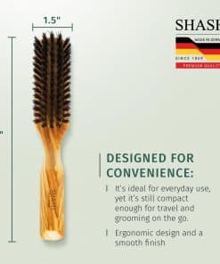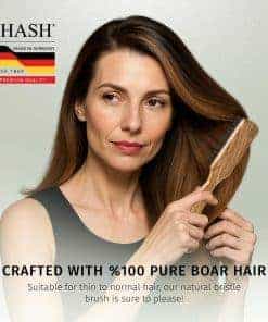 Cepillo de pelo hecho en Alemania con cerdas de jabalí de primera calidad. Adecuado para cabello delgado a normal. Acondiciona naturalmente el cabello, mejora la textura, exfolia y estimula. Instrucciones básicas para cepillar el cabello: Para cabello seco, cepille suavemente para evitar el encrespamiento o la rotura. Para cabello húmedo, use un cepillo de púas de madera diseñado para cabello mojado. Comience desde abajo, cepillando desde las puntas hasta las raíces para prevenir enredos. Para un estilo perfecto, es necesario peinar el cabello por secciones. Limpie sus cepillos regularmente para evitar la acumulación de cabello, aceites y productos. Verifique si las cerdas no están dobladas o rotas. Reemplace los cepillos desgastados para un cuidado adecuado de su cabello. Advertencias: Evite cepillar de manera agresiva, especialmente para cabello rizado o fino. Tenga cuidado con el calor al usar herramientas térmicas con cepillos. No se exceda en el cepillado, ya que puede causar daño y rotura del cabello.