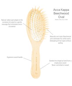Los cepillos neumáticos de Acca Kappa están diseñados ergonómicamente para reducir el daño estructural en el cabello al cepillarlo. Los pines de madera en forma de cono penetran fácilmente en el cabello, mientras que la punta redondeada de cada pin de madera masajea suavemente el cuero cabelludo. Nuestros cepillos de madera de haya están acabados a mano y nunca se barnizan. La madera de haya es naturalmente antiestática.