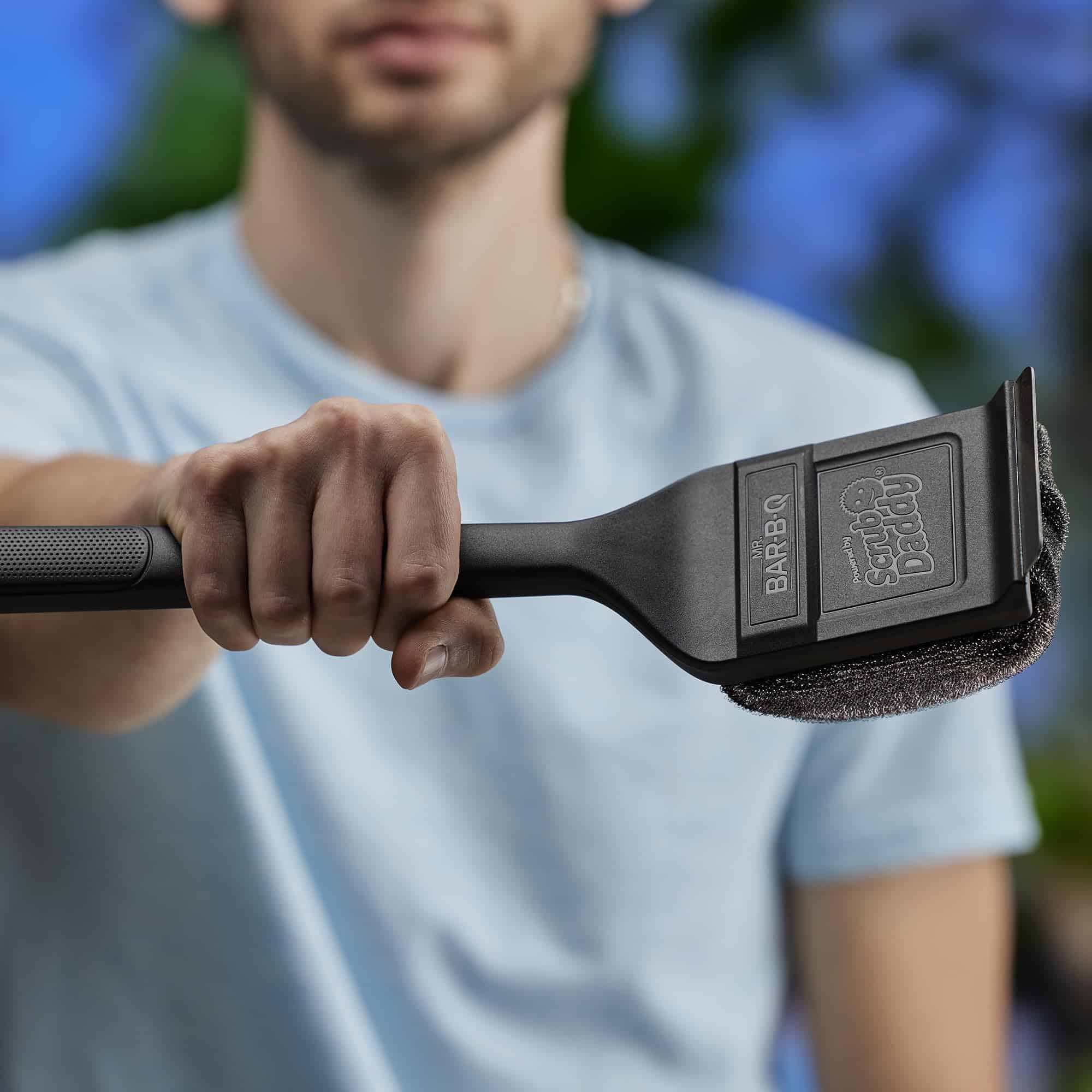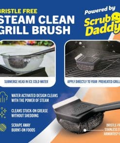 Todo entusiasta de las barbacoas necesita un cepillo para parrilla que limpie de forma rápida y sencilla, manteniendo sus parrillas listas para la próxima reunión. ¡Limpia tu sucia parrilla con el Cepillo para Parrilla a Vapor Mr. Bar-B-Q Potenciado por Scrub Daddy! Este diseño activado por agua limpia con el poder del vapor utilizando la esponja de Scrub Daddy. Simplemente sumerge la cabeza de fregado en agua helada y aplícala directamente a tu parrilla precalentada a 300 °F para dejar que el vapor derrita la suciedad. No importa en qué estado se encuentre tu parrilla; el Cepillo para Parrilla a Vapor puede limpiarla. ¡No te preocupes más por las cerdas de alambre suelto! Este cepillo te tiene cubierto. La esponja flexible es lo suficientemente fuerte para fregar alimentos quemados obstinados y lo suficientemente suave para entrar entre las rejillas. Independientemente del tipo de parrilla, el cepillo para parrilla es eficiente y seguro para parrillas de carbón, ahumadores, kamado, parrillas eléctricas y mucho más. El raspador resistente es perfecto para eliminar cualquier acumulación de grasa.