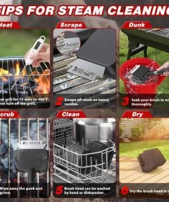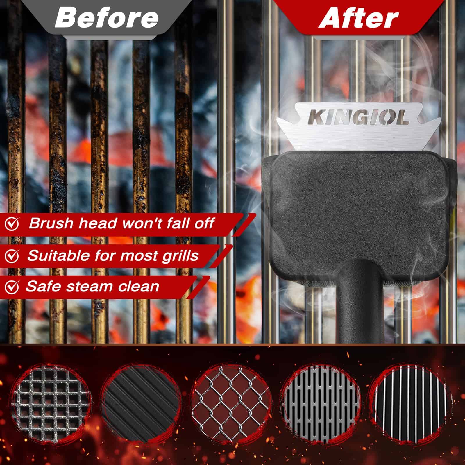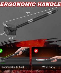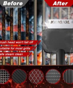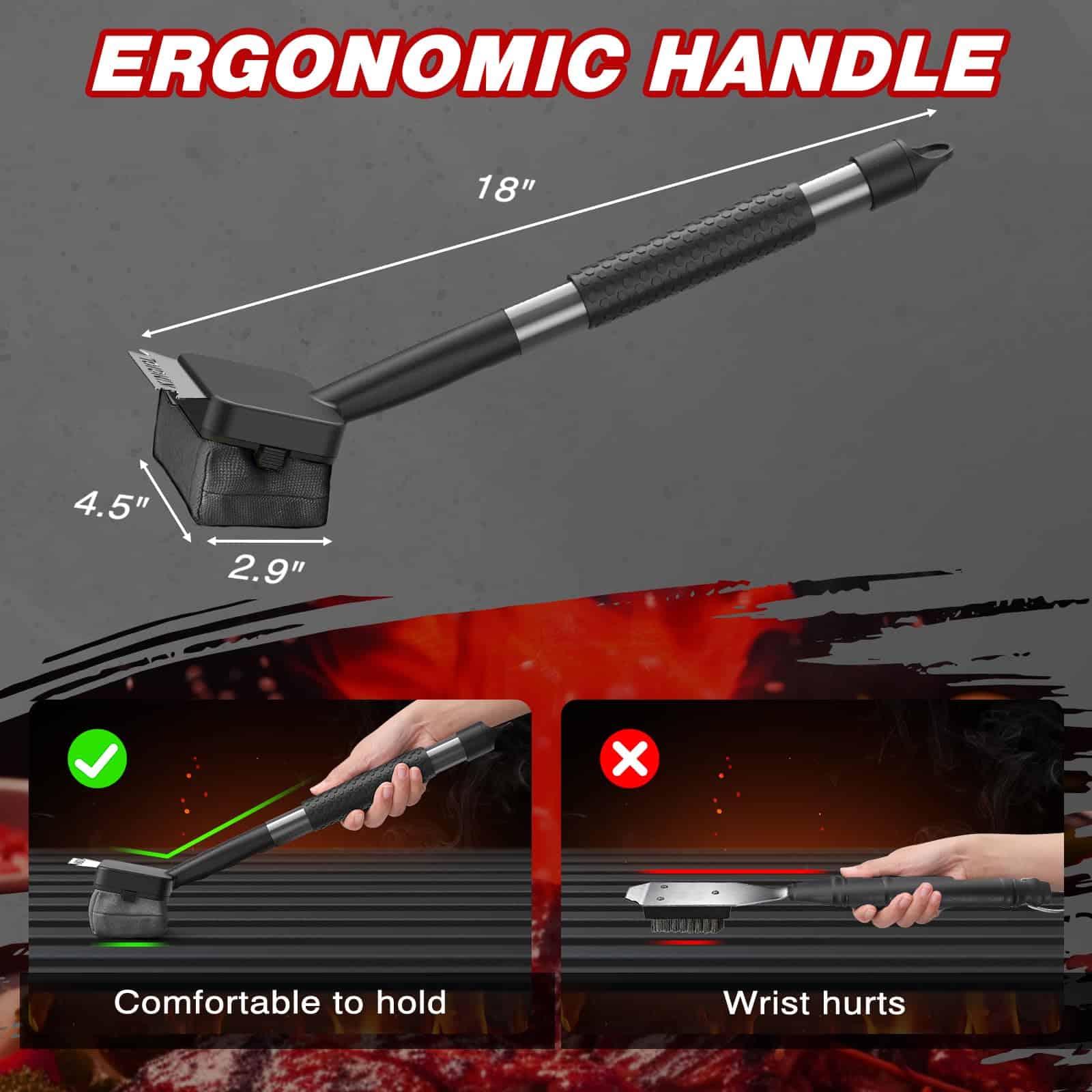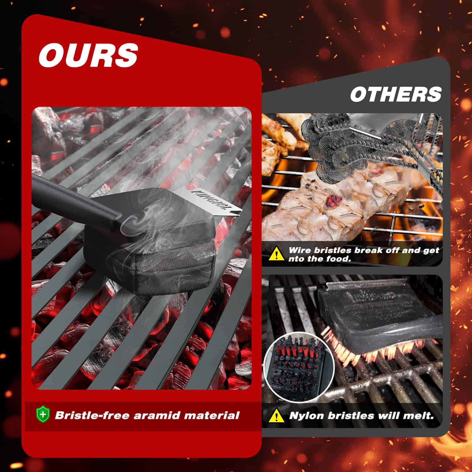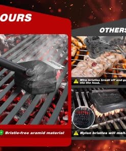 ¡Dile adiós a los cepillos de alambre para tu salud! Nuestro cepillo para parrilla está hecho de fibra de aramida, sin cerdas y resistente a altas temperaturas, eliminando el riesgo de que las cerdas de alambre se mezclen en la comida, ¡y permitiéndote disfrutar de una experiencia de BBQ segura y confiable! El cabezal del cepillo es de fibra de aramida negra que no se derrite a altas temperaturas. El material negro es más resistente a las manchas que el cabezal de cepillo amarillo ordinario. El cabezal del cepillo está fijado con una fuerte hebilla y no se caerá durante la limpieza. Calienta la parrilla a 400 F, apaga los quemadores y usa las 2 ranuras curvas del raspador para raspar la suciedad obstinada entre las rejillas de la parrilla. Luego sumerge el cabezal del cepillo de fibra de aramida o acero en agua y elimina los residuos de la parrilla. Nuestros mangos de acero inoxidable no se doblarán ni se romperán y cuentan con un gancho para un fácil almacenamiento. El mango de 45 grados es ergonómico y cómodo de sostener, reduciendo la fatiga de muñecas y brazos. El silicona antideslizante en el mango evita eficazmente que el cepillo se deslice. Puedes quitar el cabezal del cepillo de parrilla del mango después de usarlo, lavarlo en el lavavajillas o a mano, y colgarlo para que se seque. Los cabezales de limpieza reemplazables están diseñados para extender la vida útil de tu cepillo para parrilla mientras te ahorran mucho dinero.